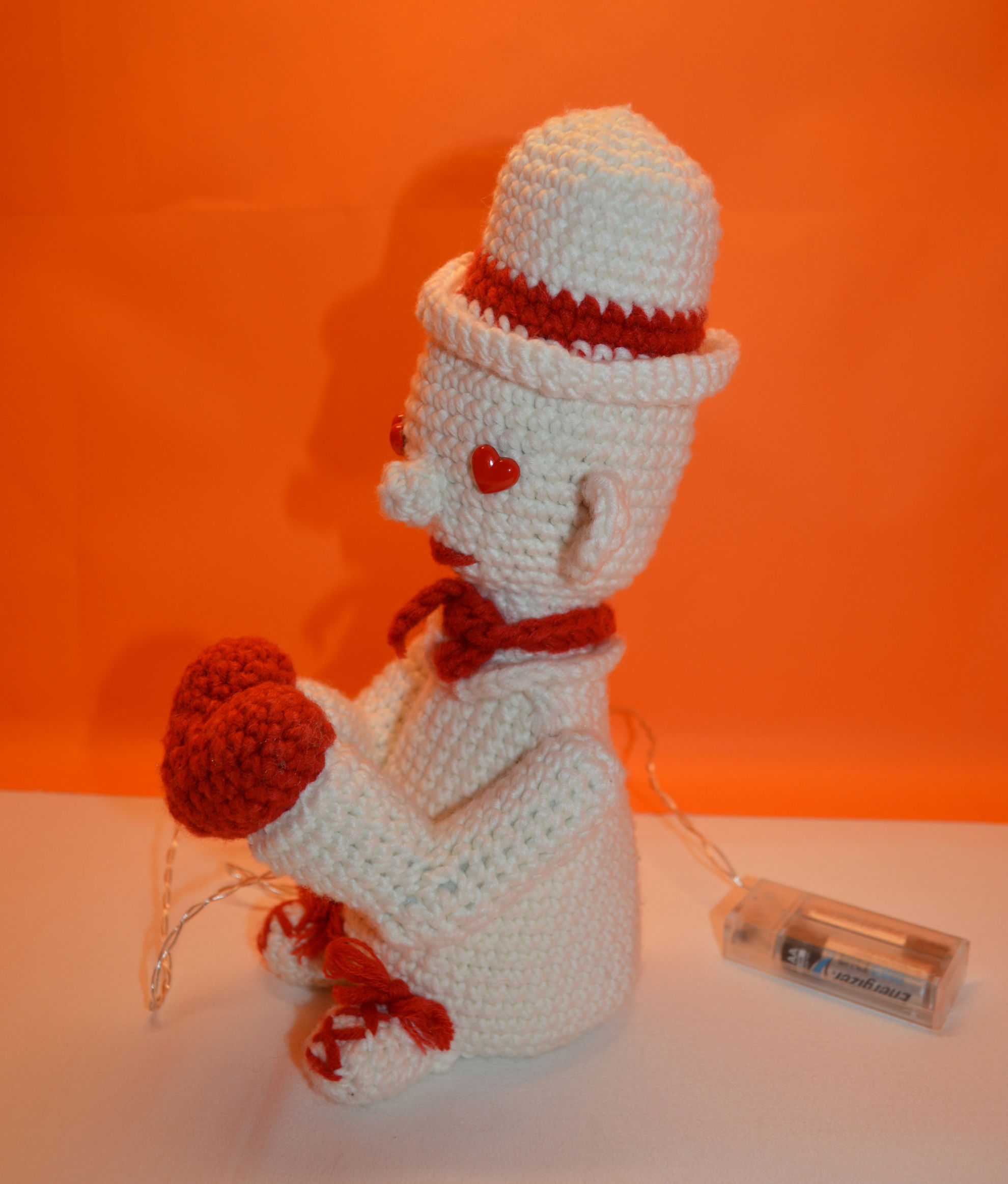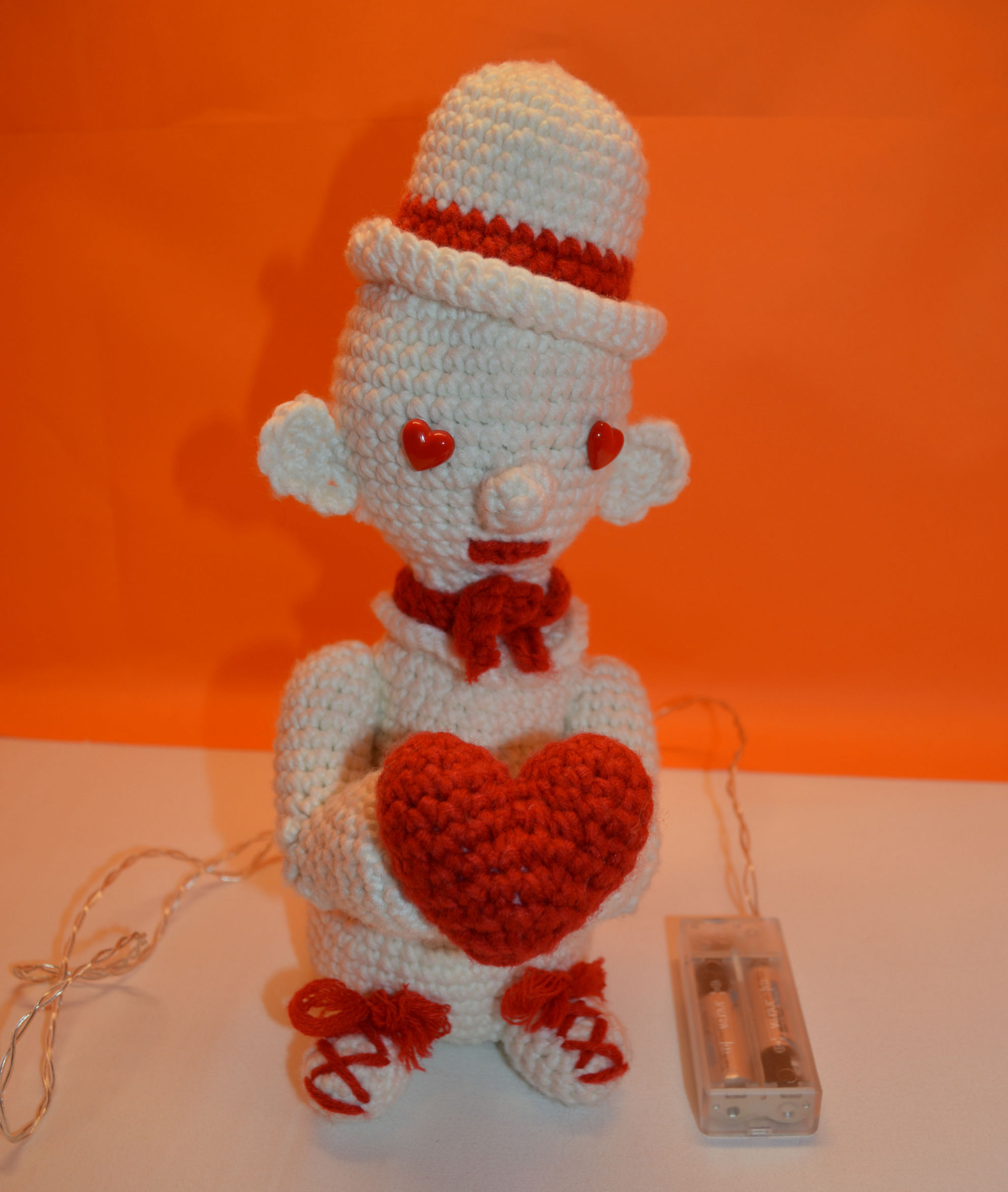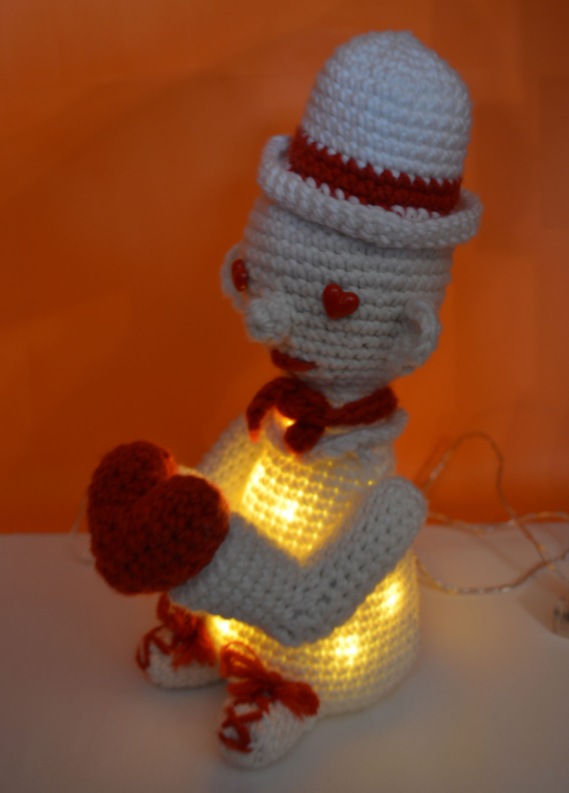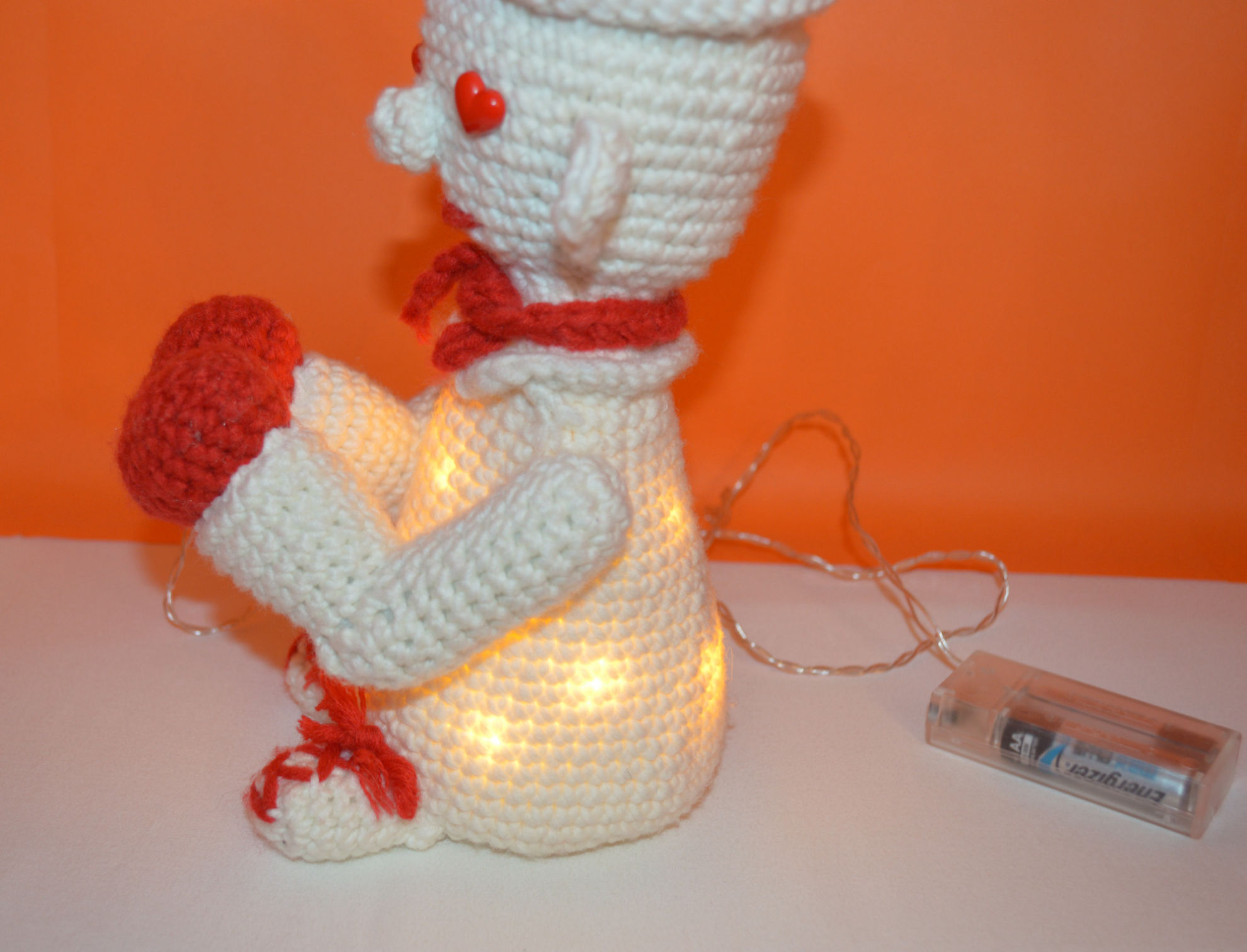 Material: Wolle Weiss, Rot, Lichterkette Batteriebetrieben, Herzknöpfe, Bastelwatte