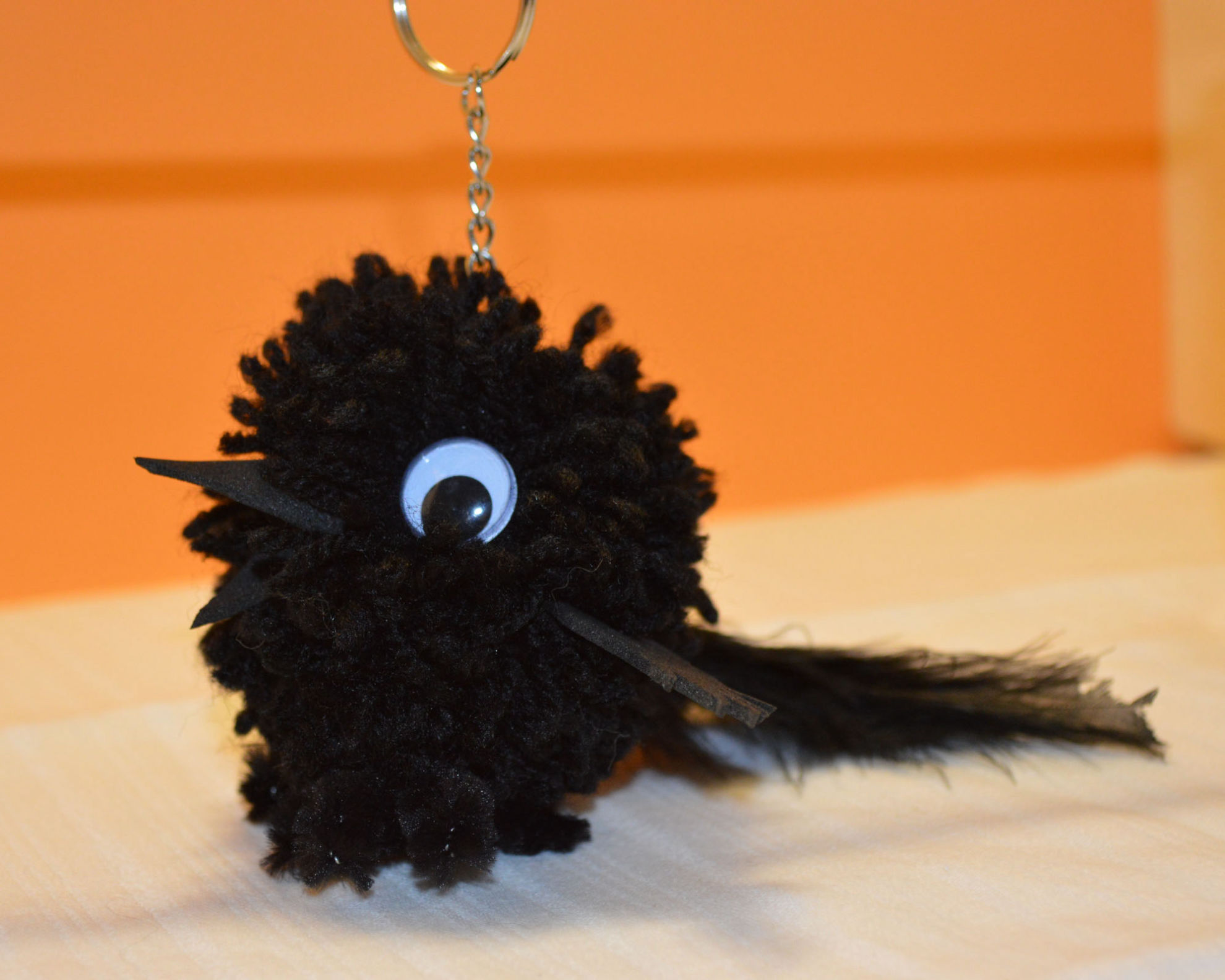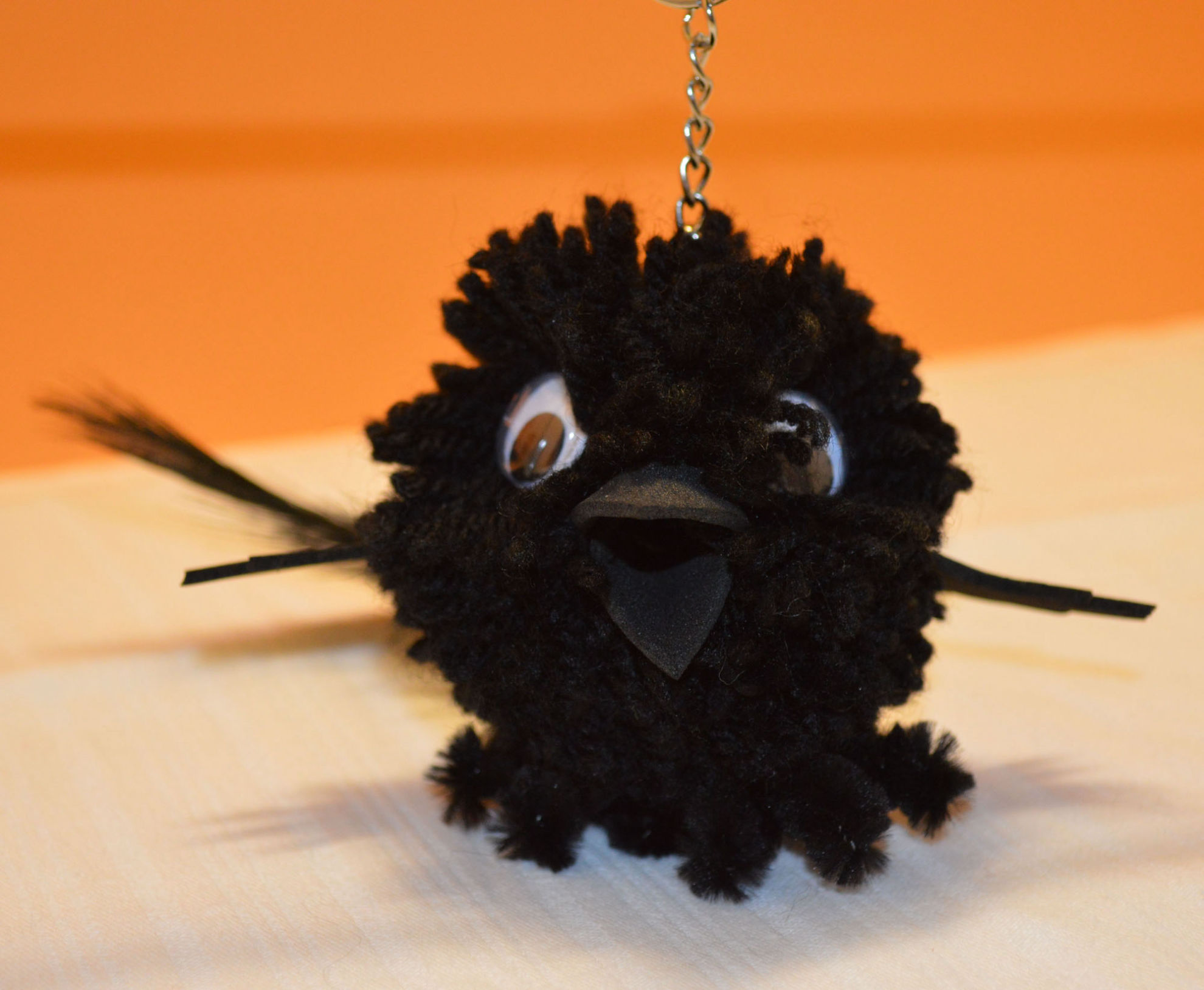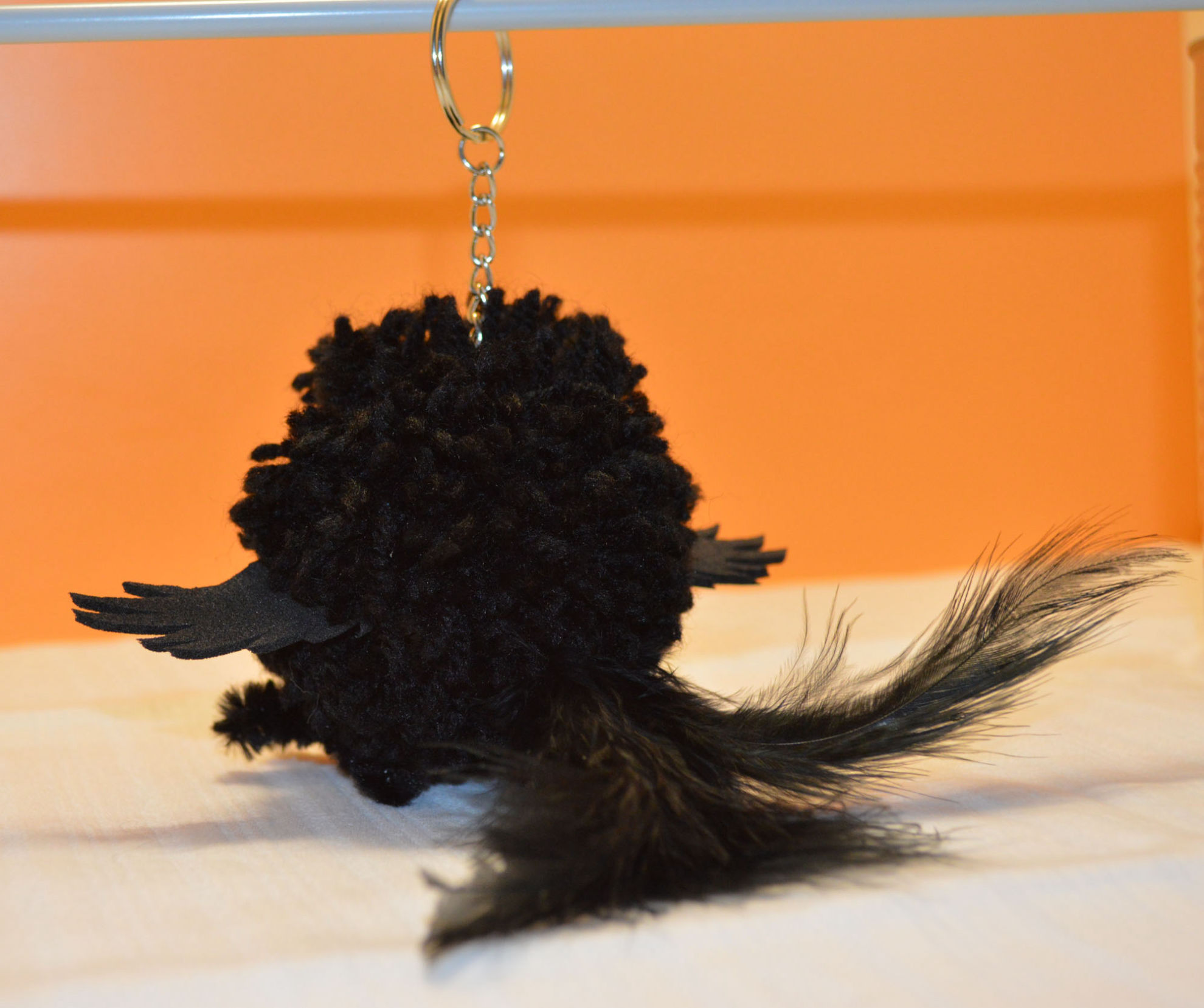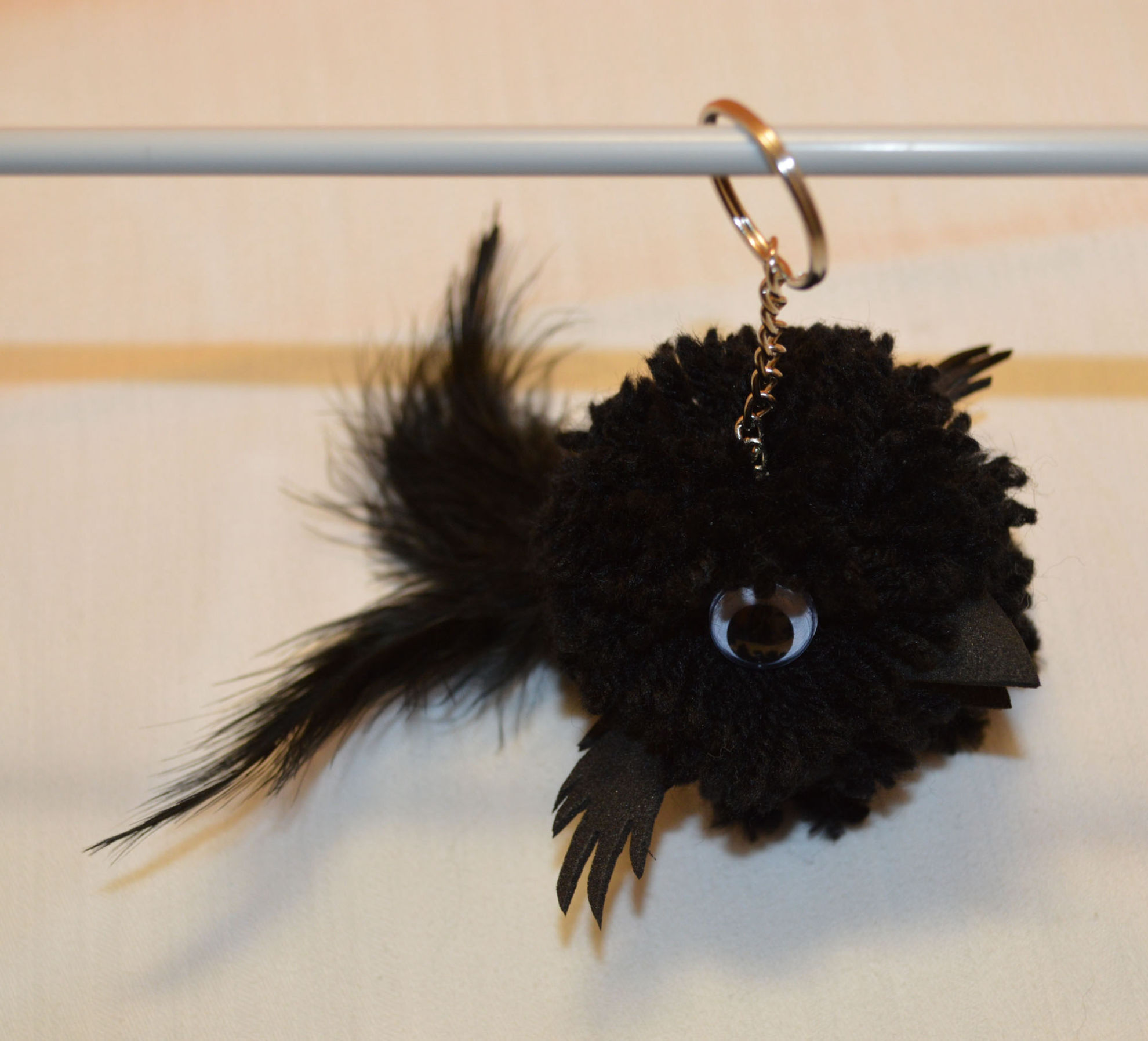 Material: Wolle Schwarz, Moosgummi, Chenillendraht, Bastelfedern, Wackelaugen, Schlüsselanhänger