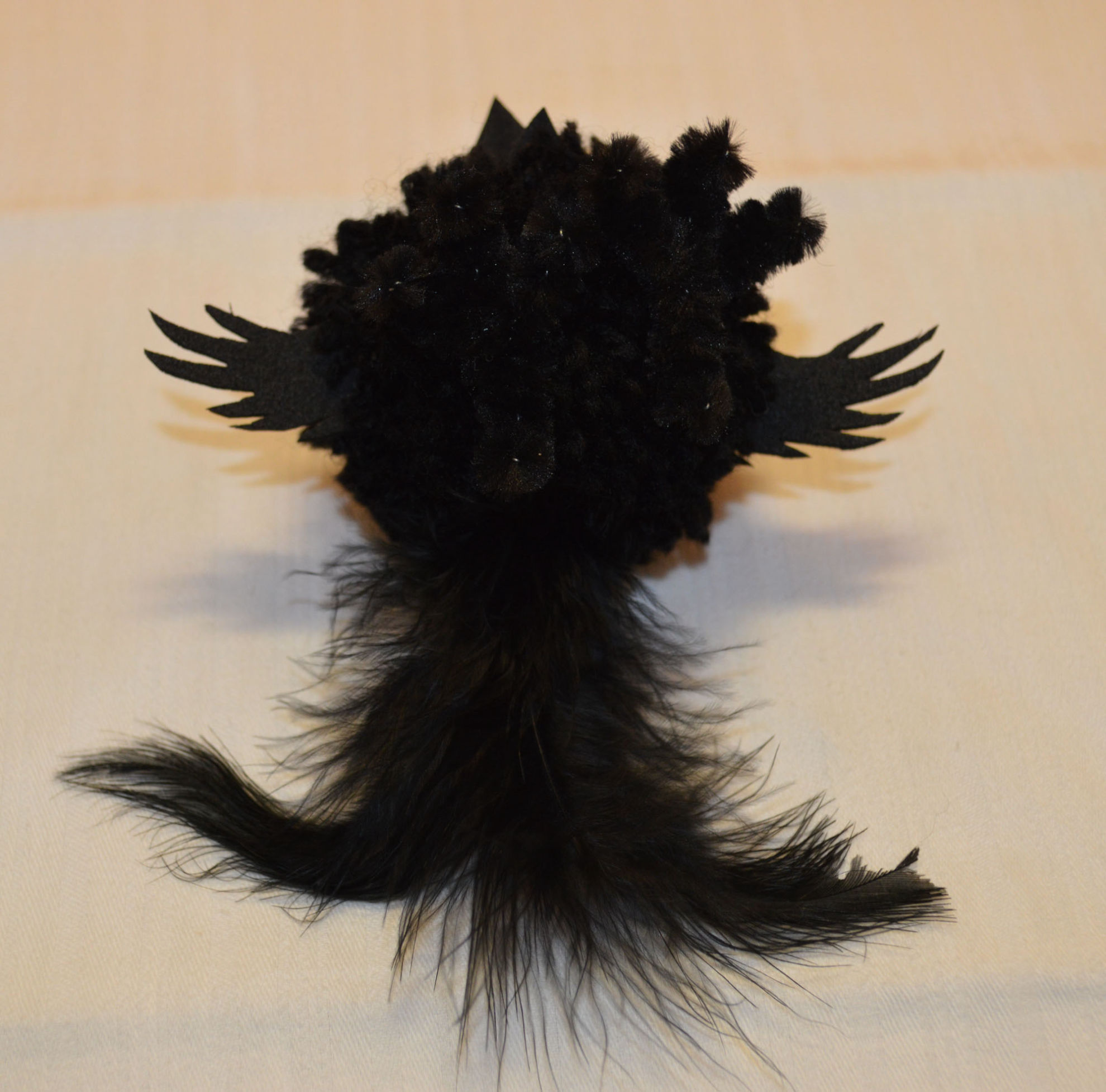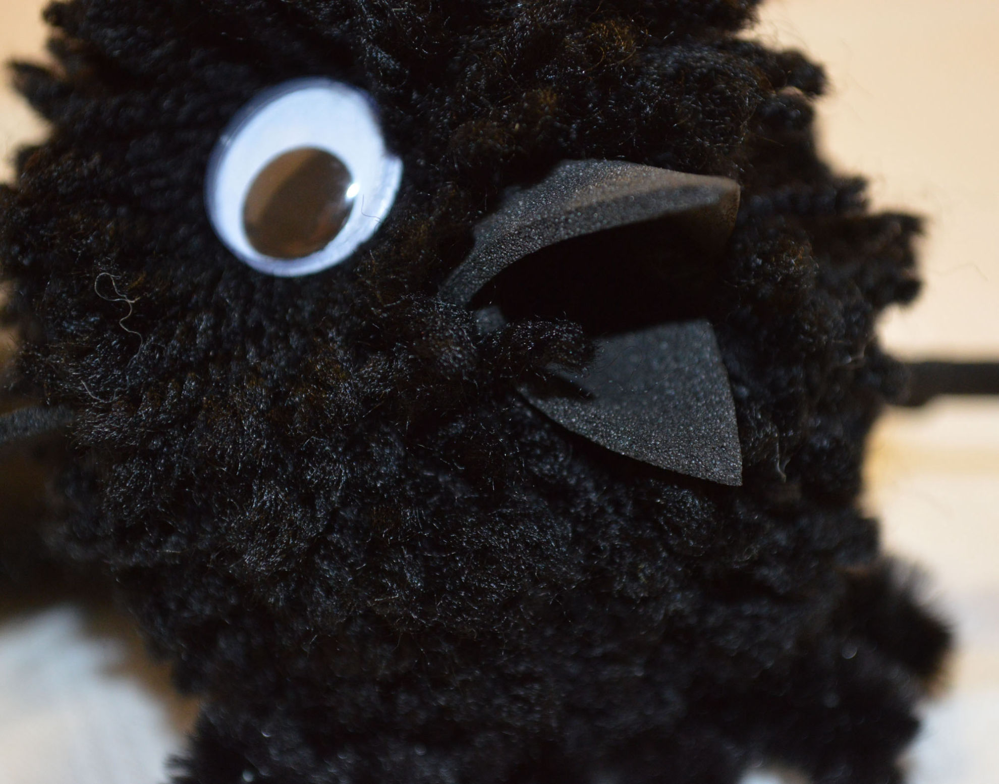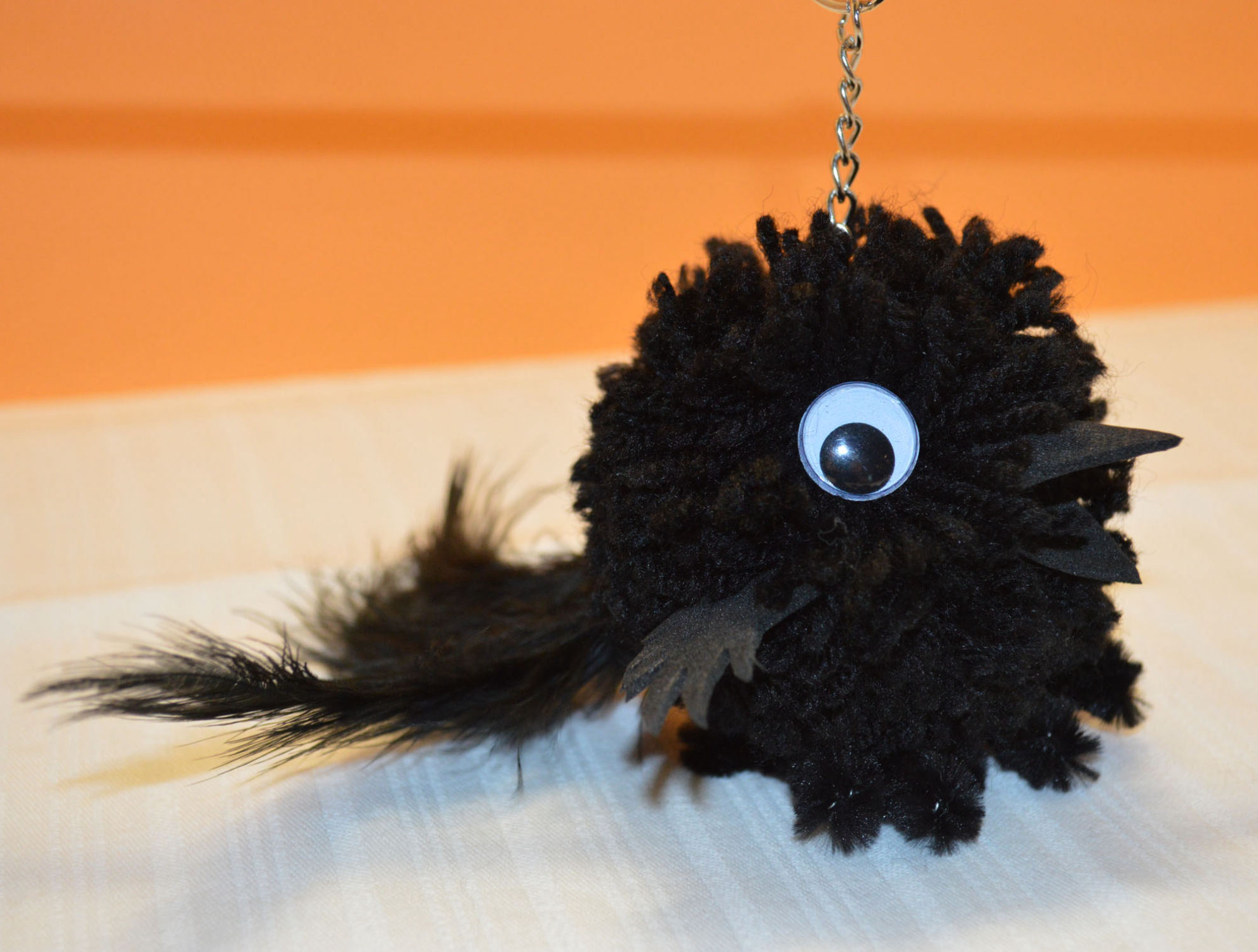 Material: Wolle Schwarz, Moosgummi, Chenillendraht, Bastelfedern, Wackelaugen, Schlüsselanhänger