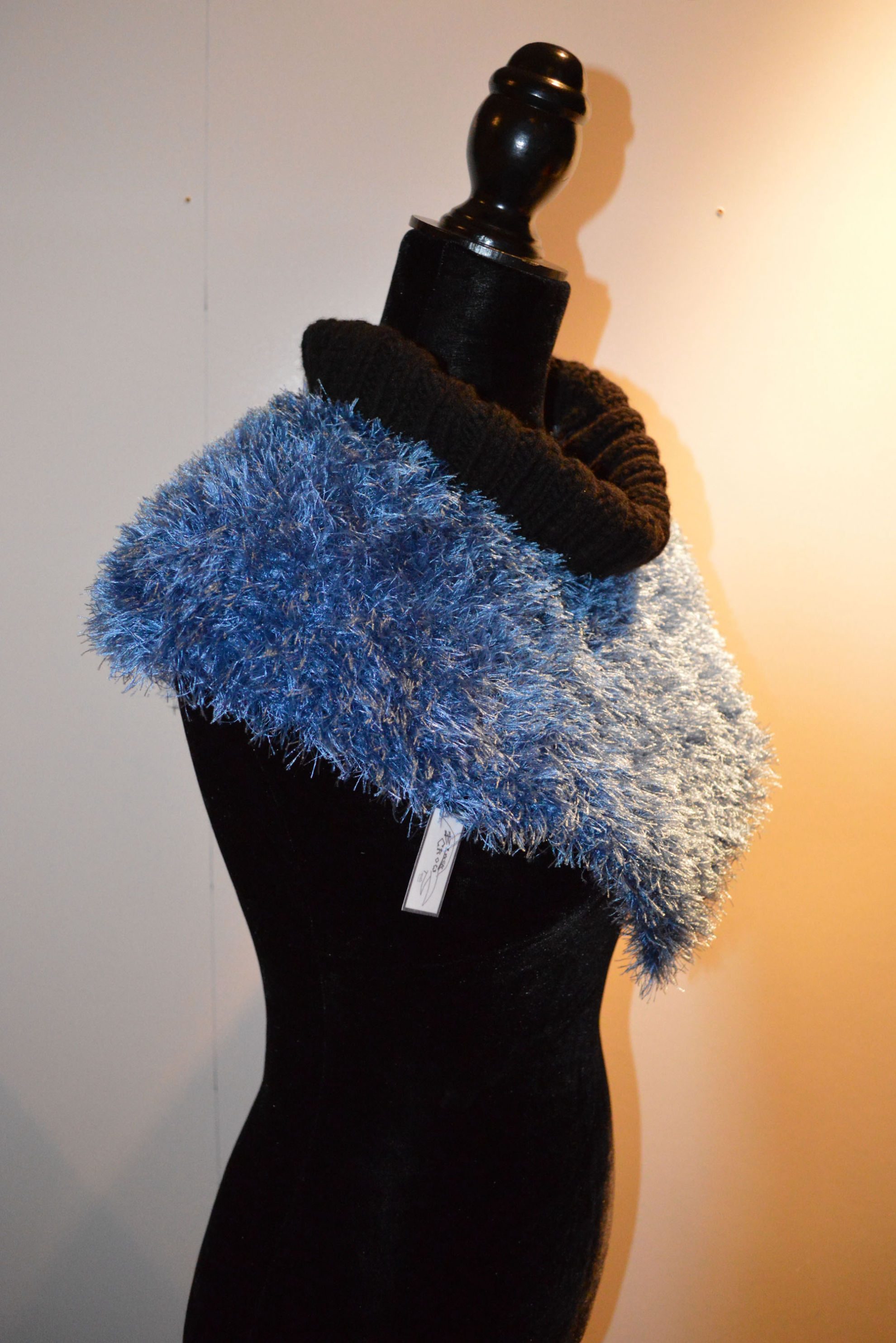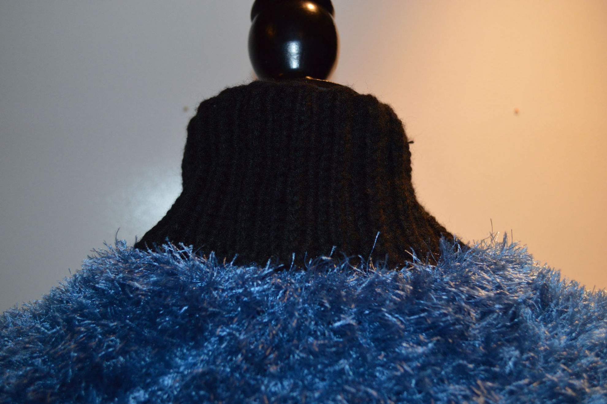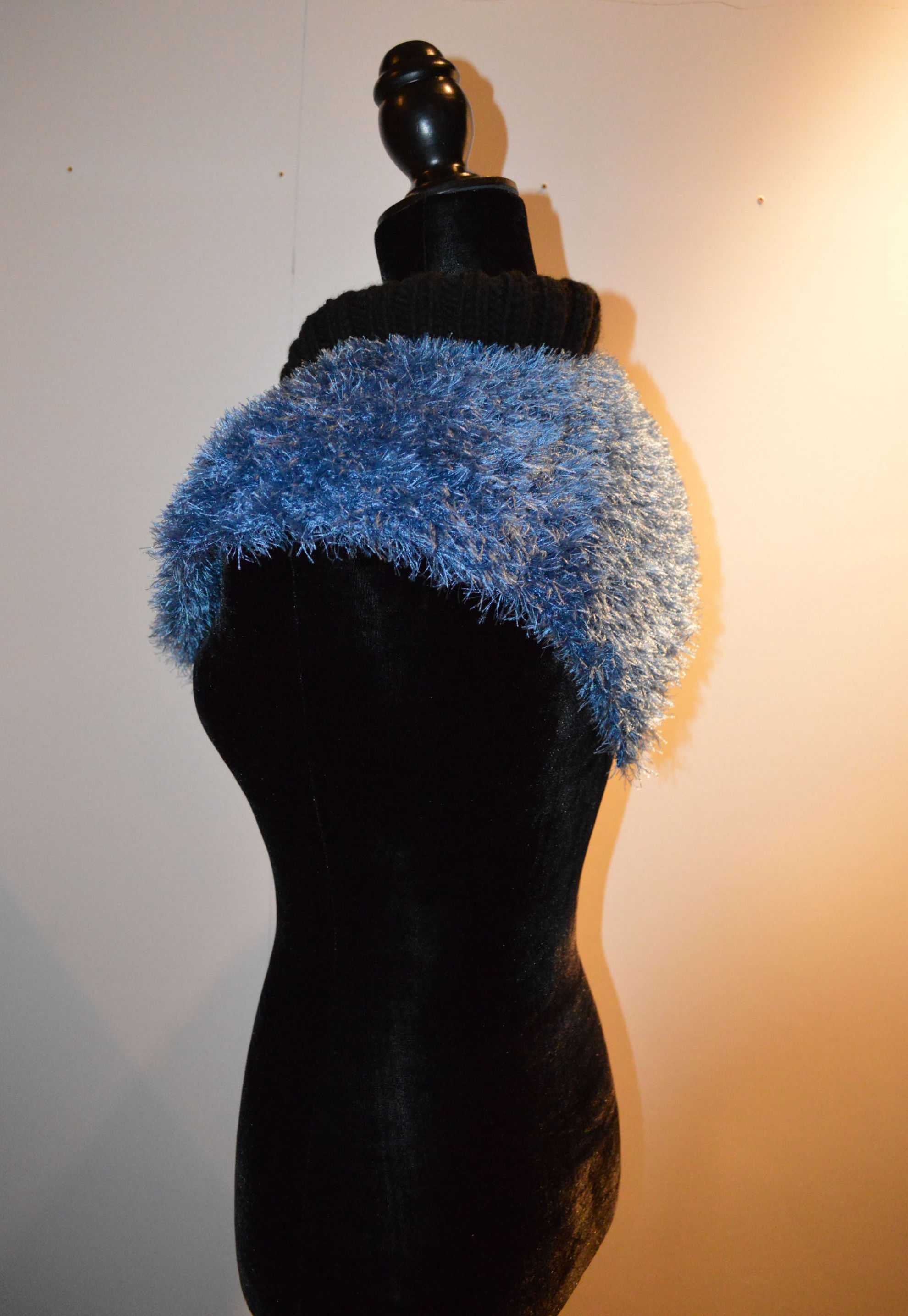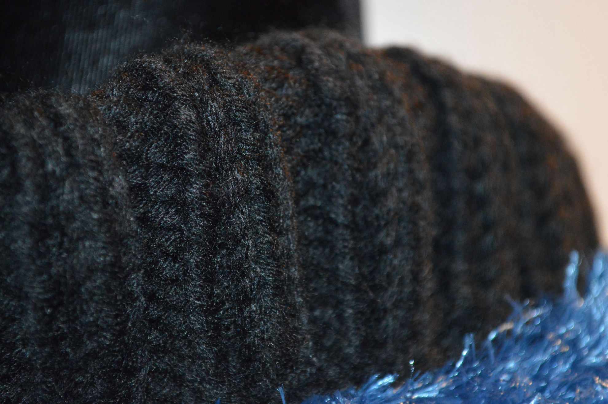 Material: Wolle, My Boshi Garn No.1 Schwarz, „Schoeller + Stahl“ la ola fashion Blau „0312“ Effektgarn/Fransengarn