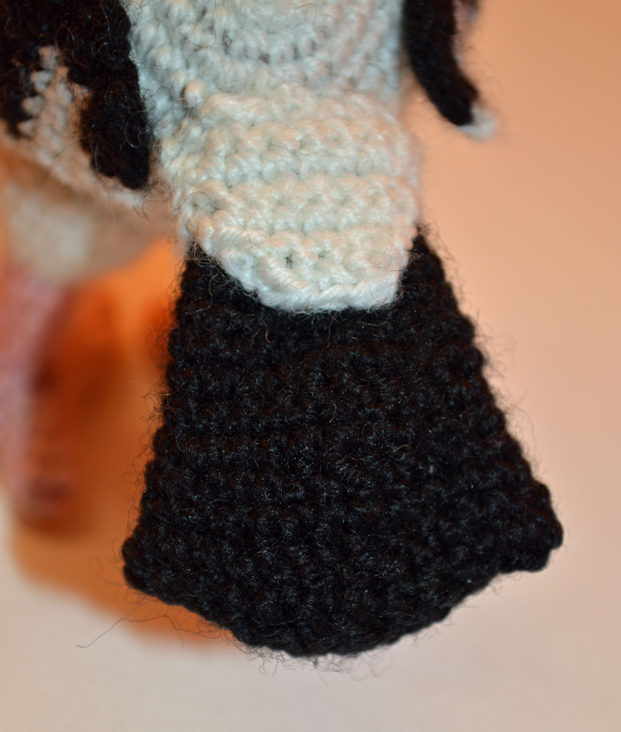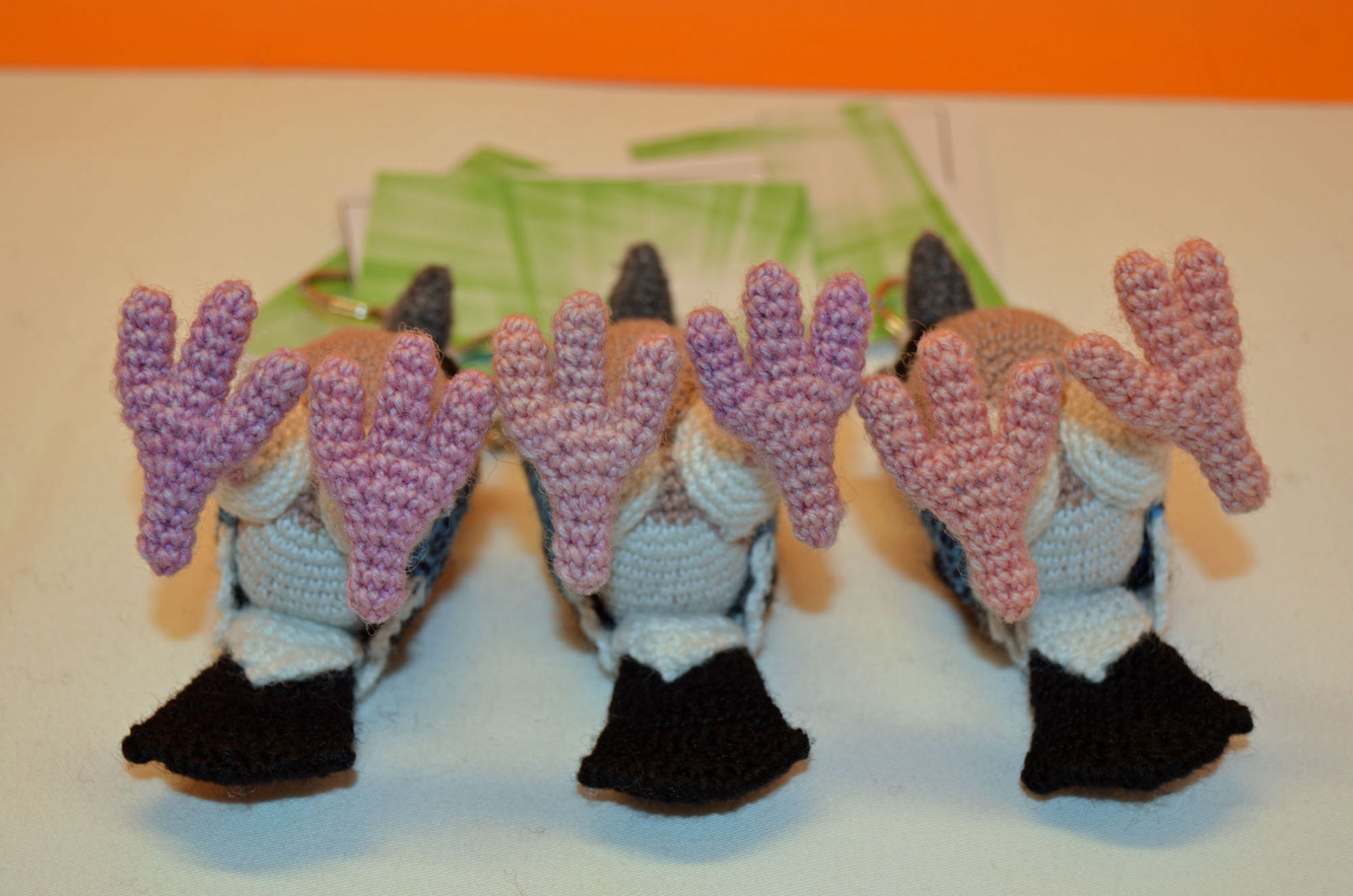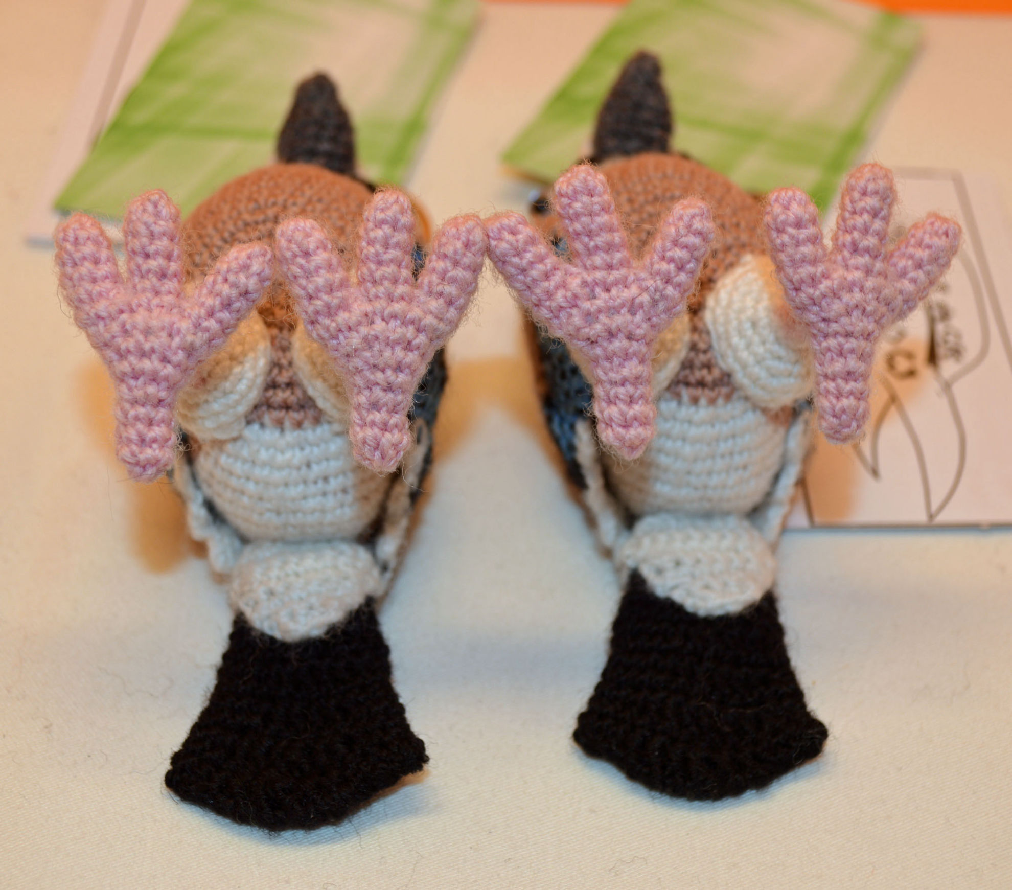 Material: Wolle Schwarz, Grau, Altrosa, Weiss, Hellblau, Rosa,                      Glasaugen, Bastelwatte