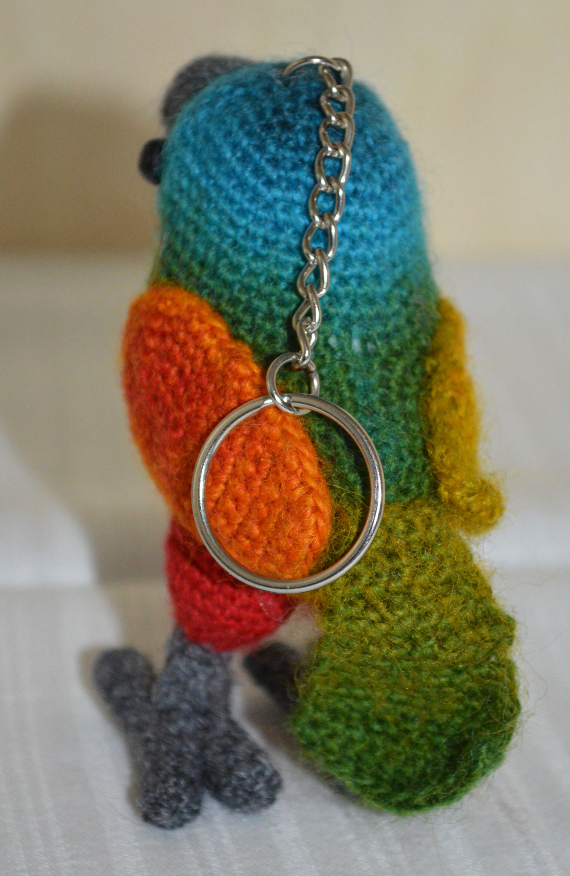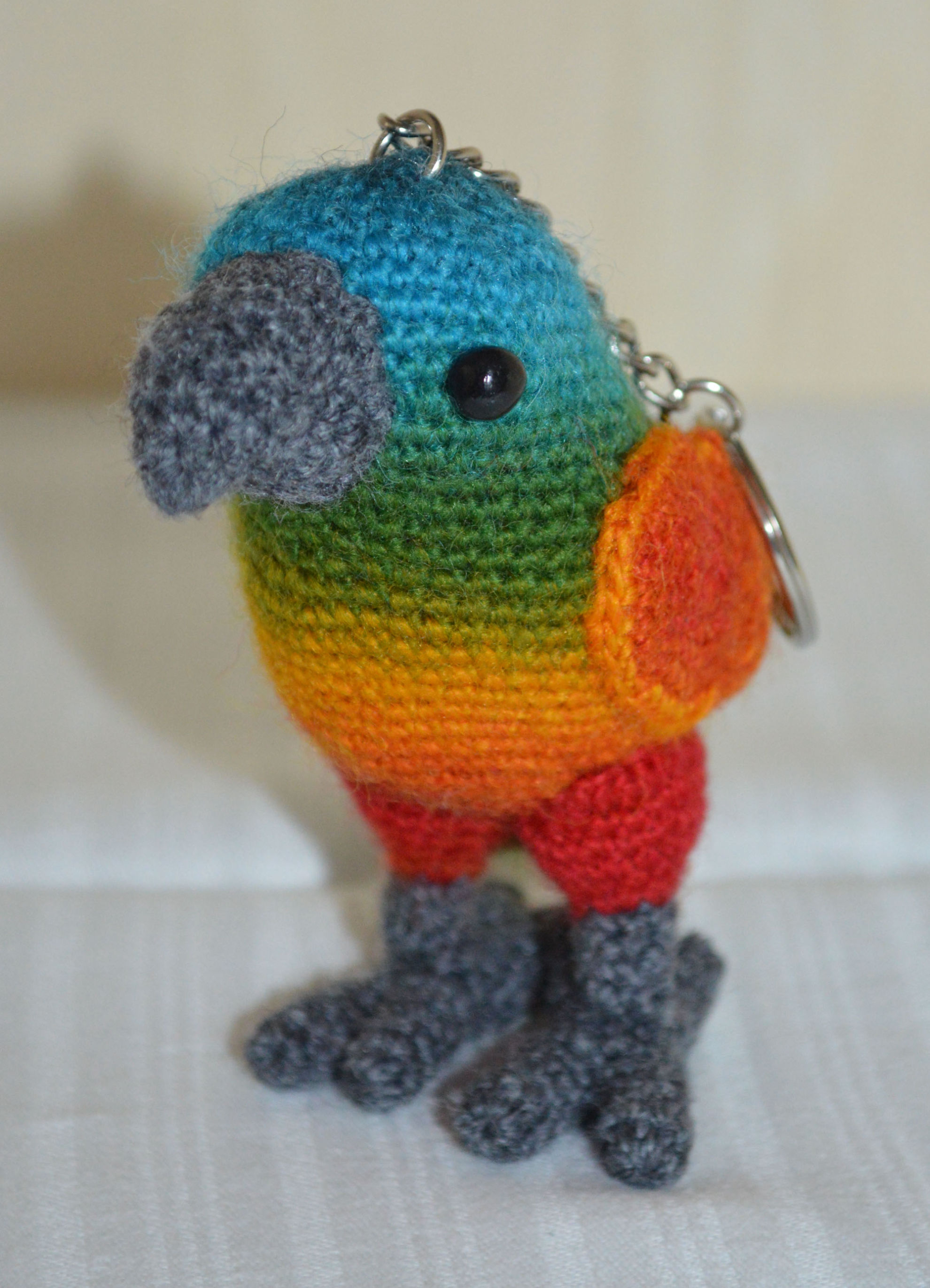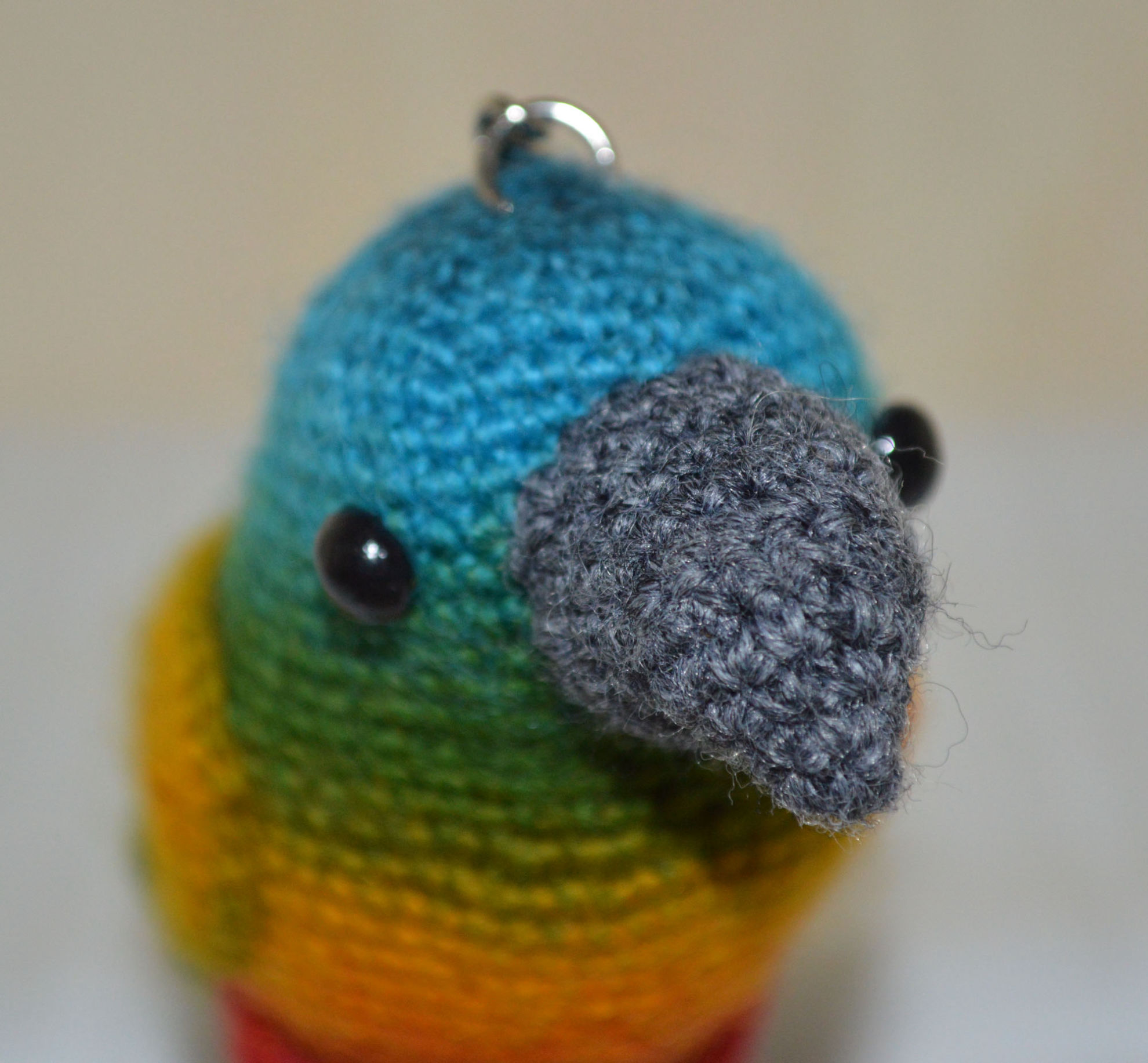 Material: Garn Multicolor, Grau, Fimo-Augen, Bastelwatte
