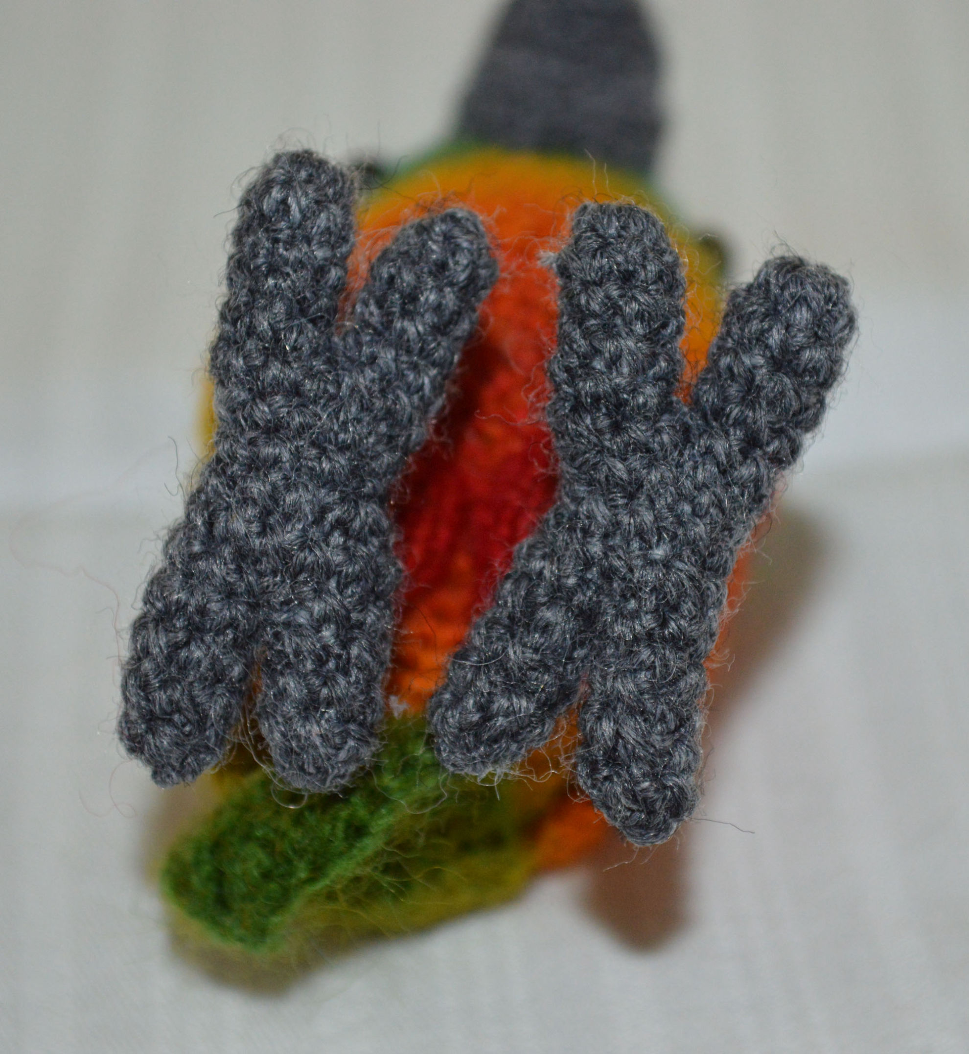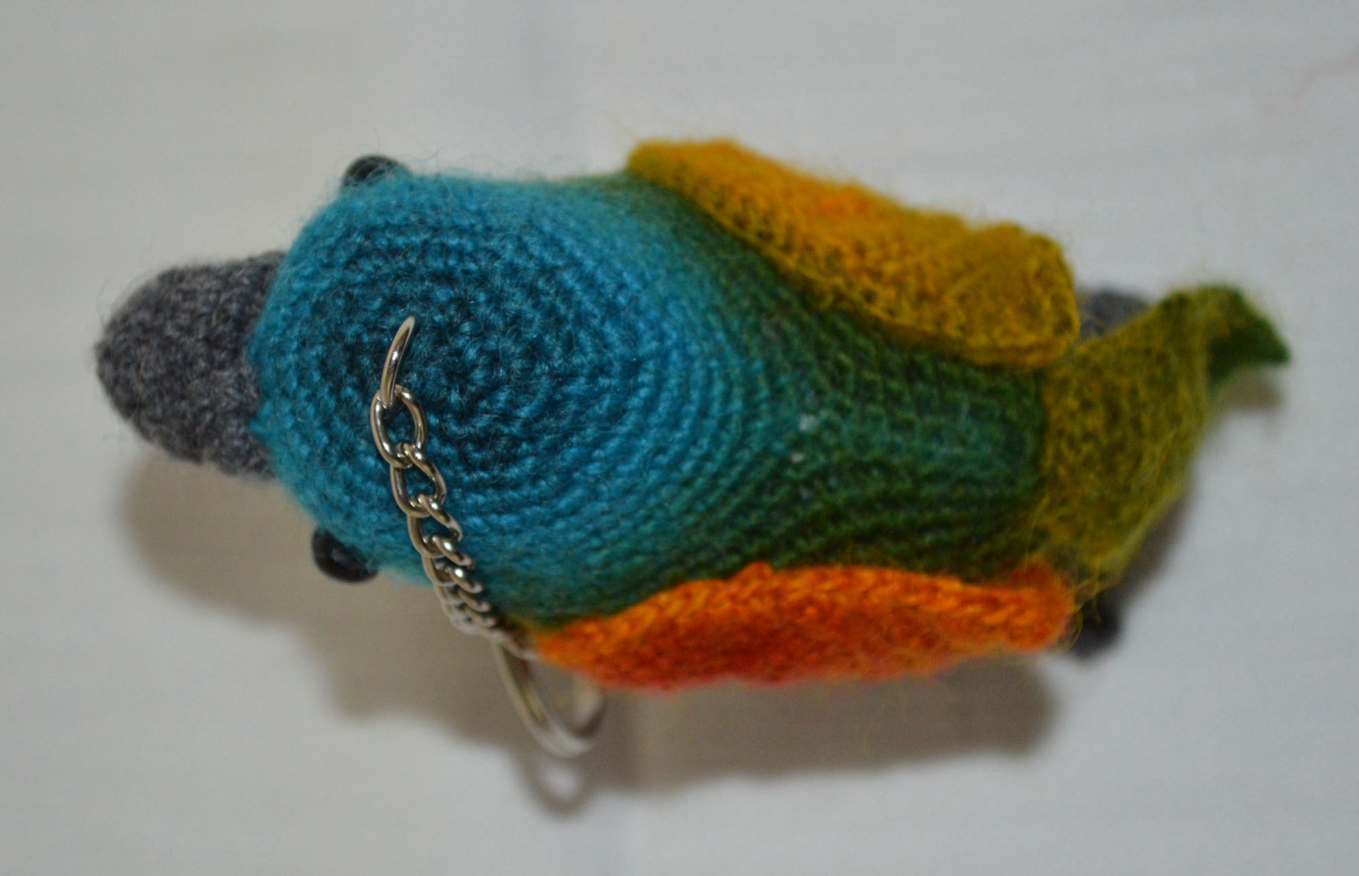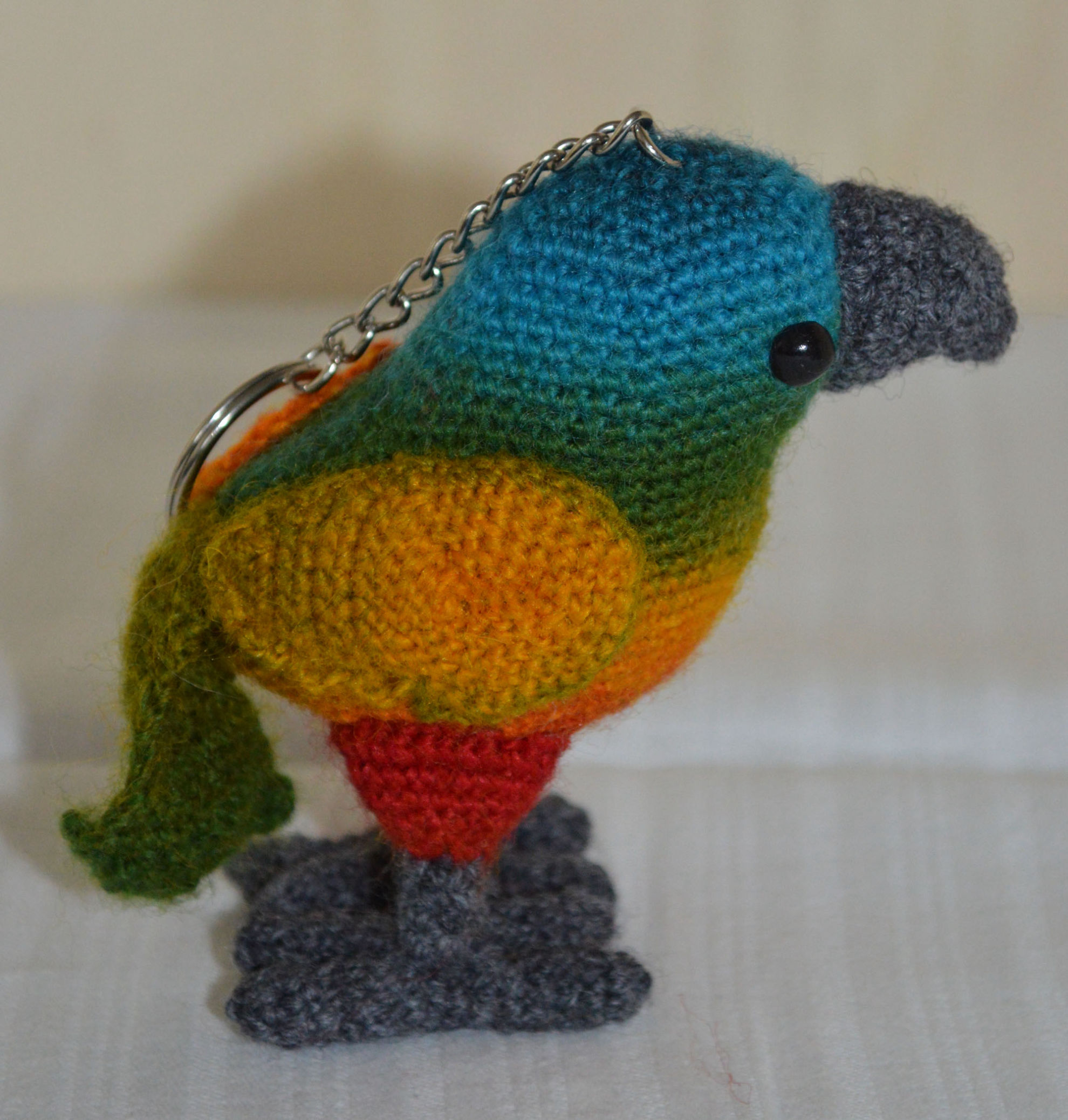 Material: Garn Multicolor, Grau, Fimo-Augen, Bastelwatte