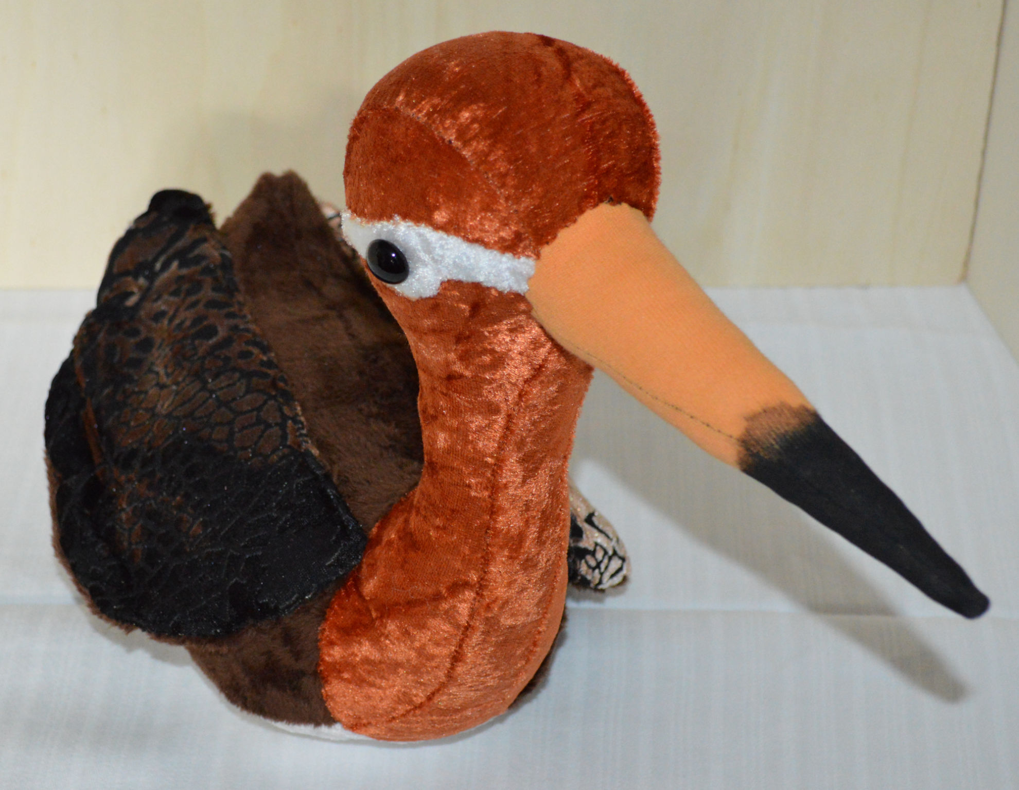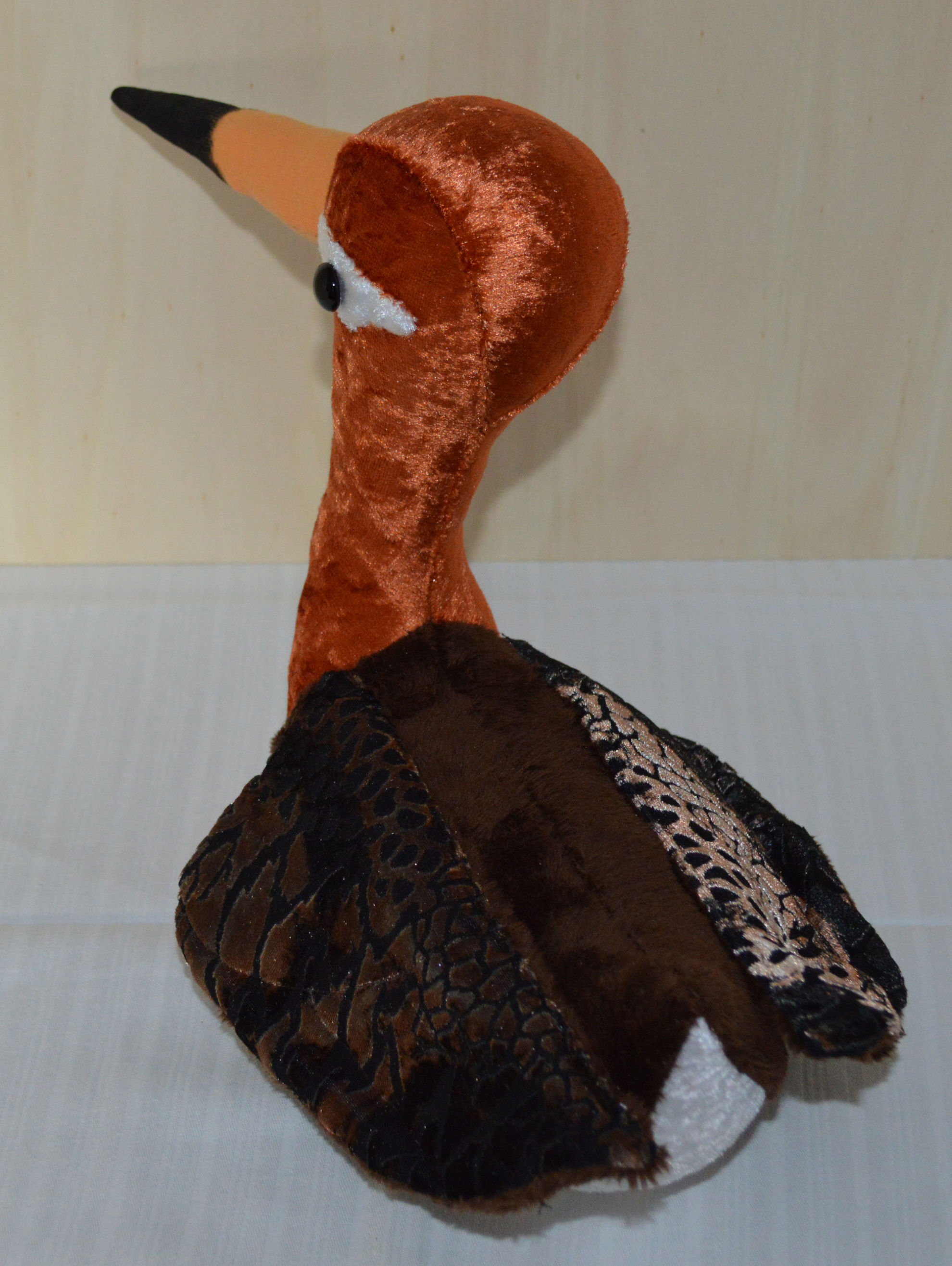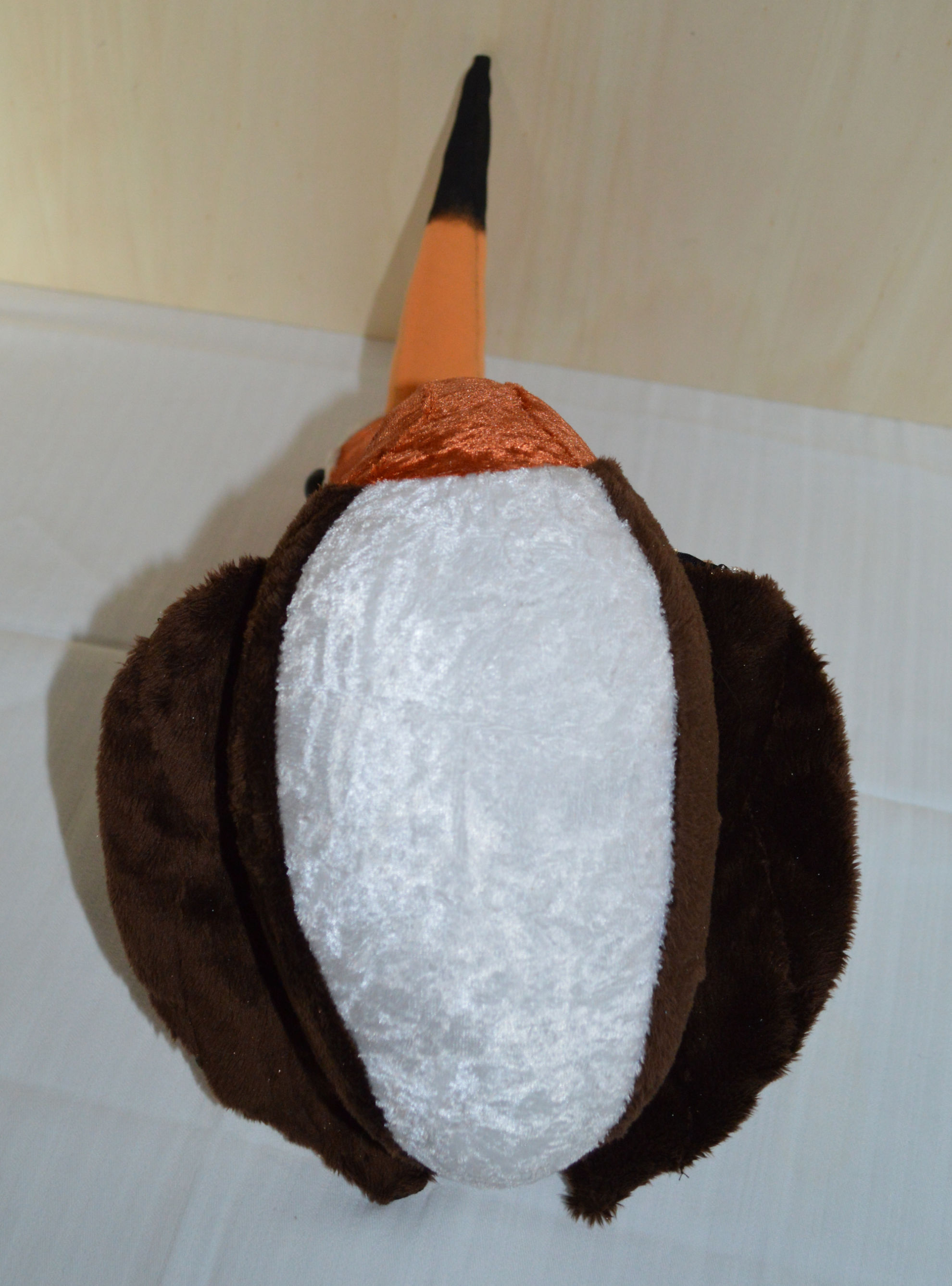 Material: Stoff Braun, Orange, Weiss, Glasaugen, Bastelwatte