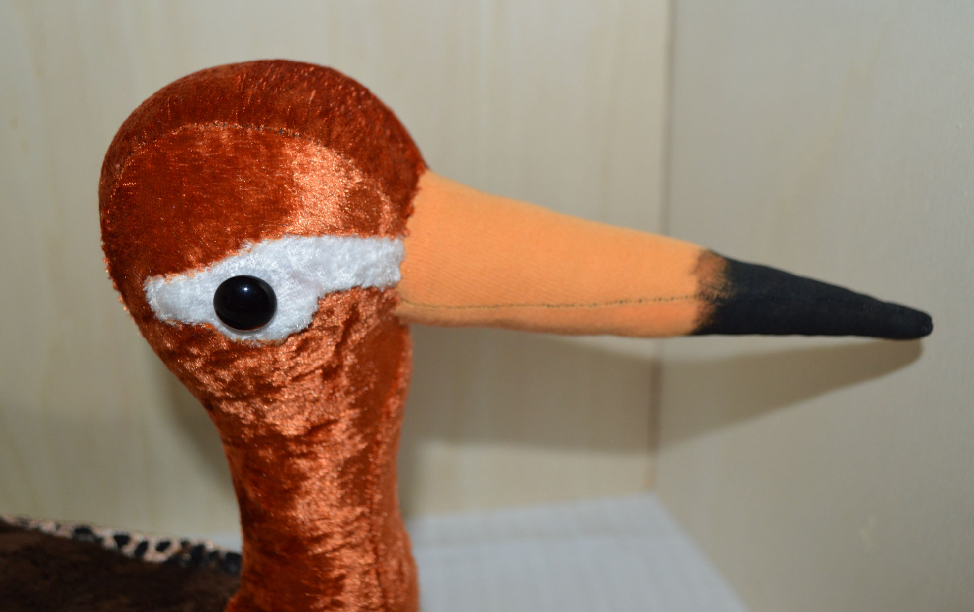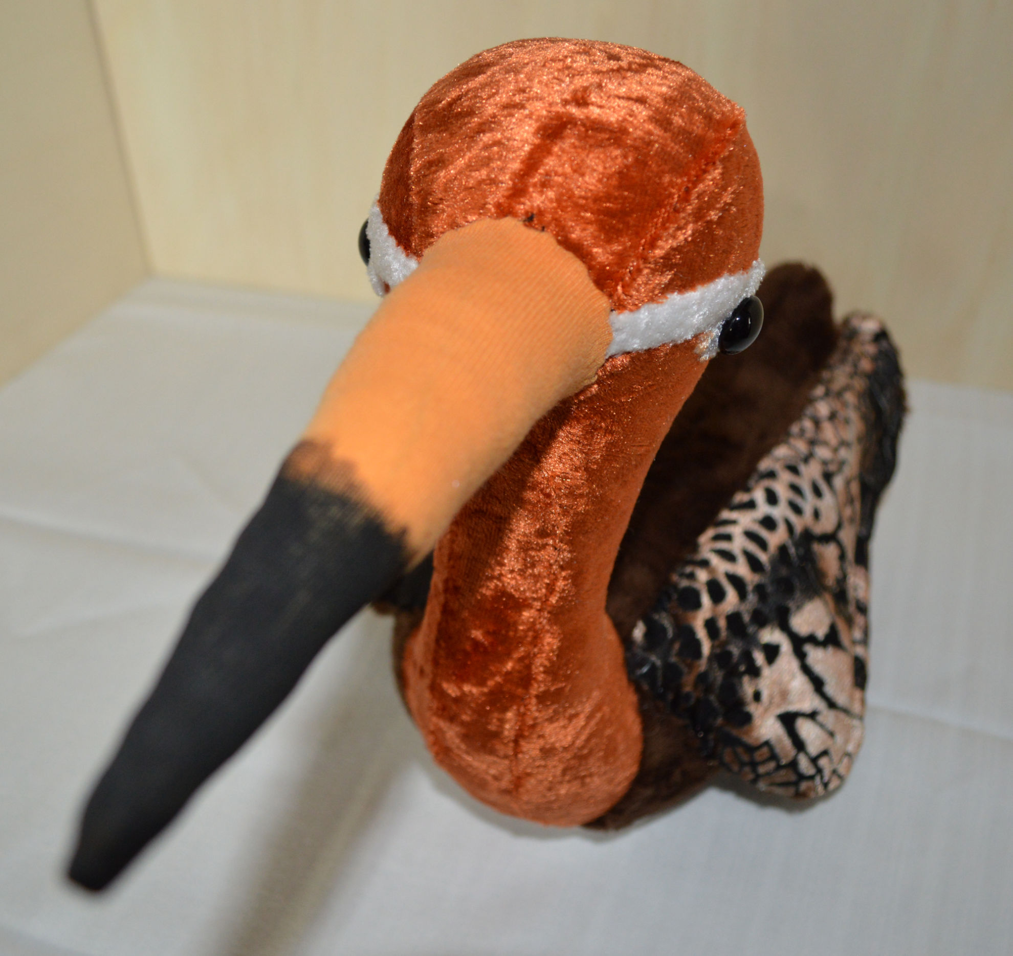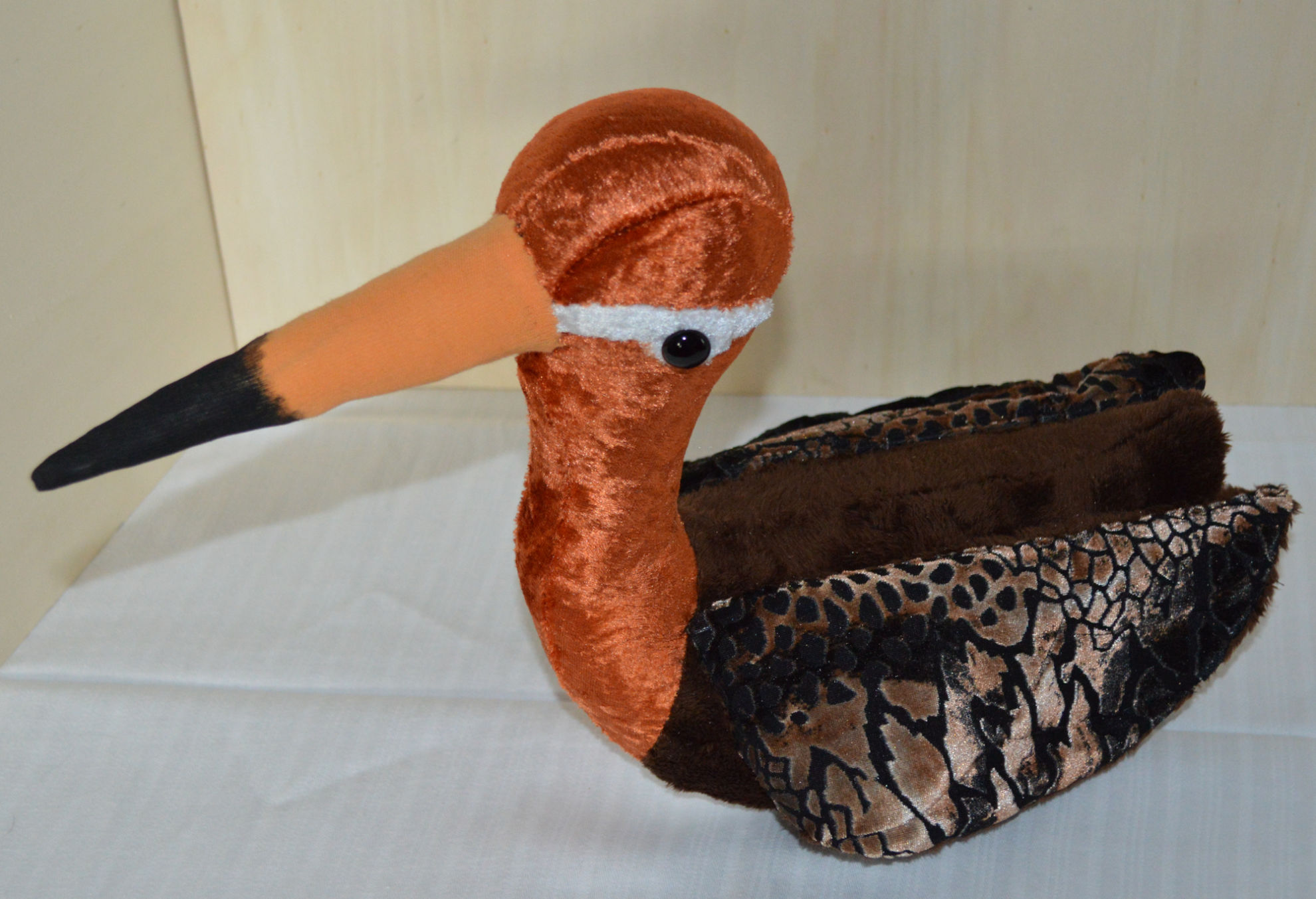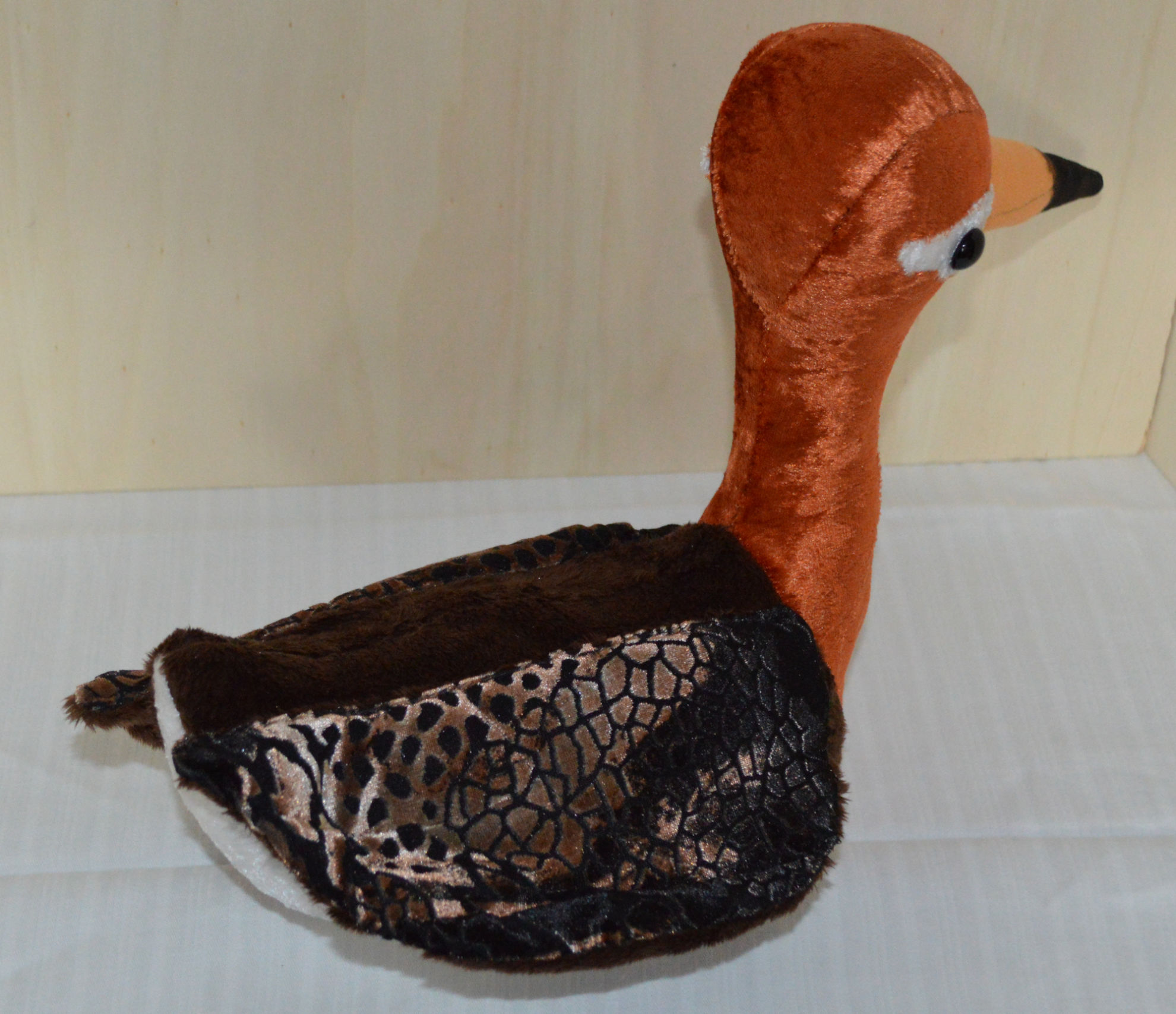 Material: Stoff Braun, Orange, Weiss, Glasaugen, Bastelwatte