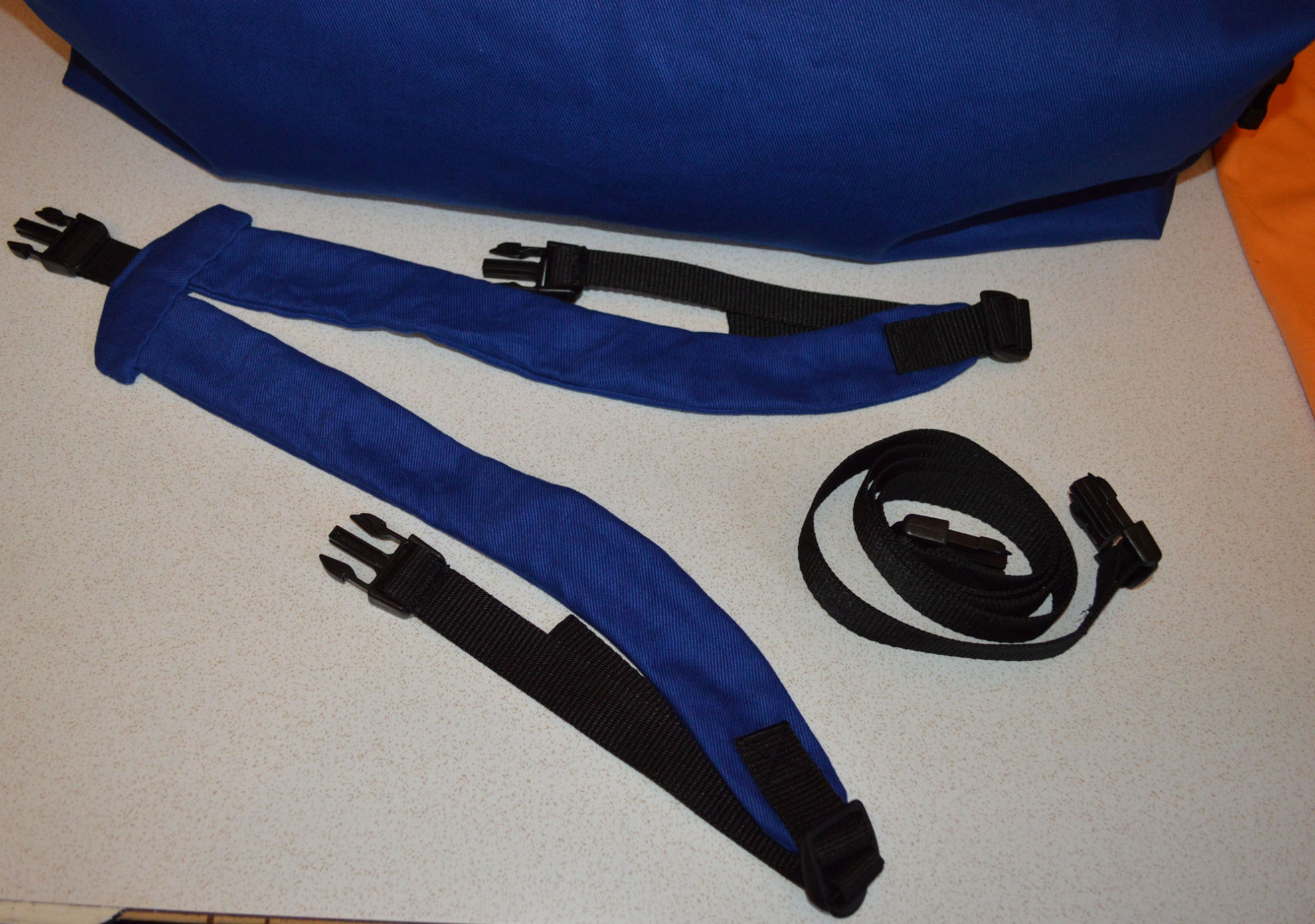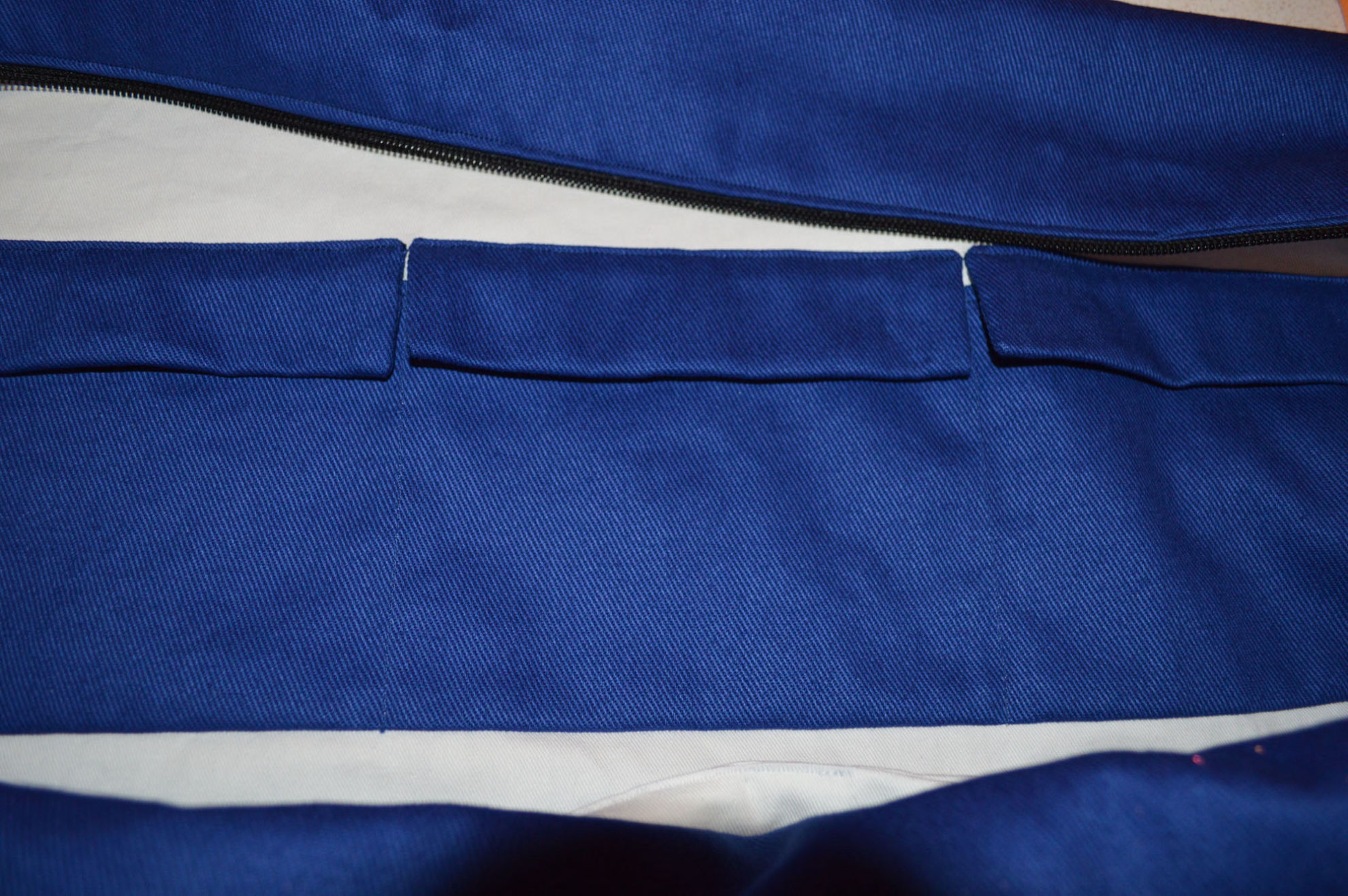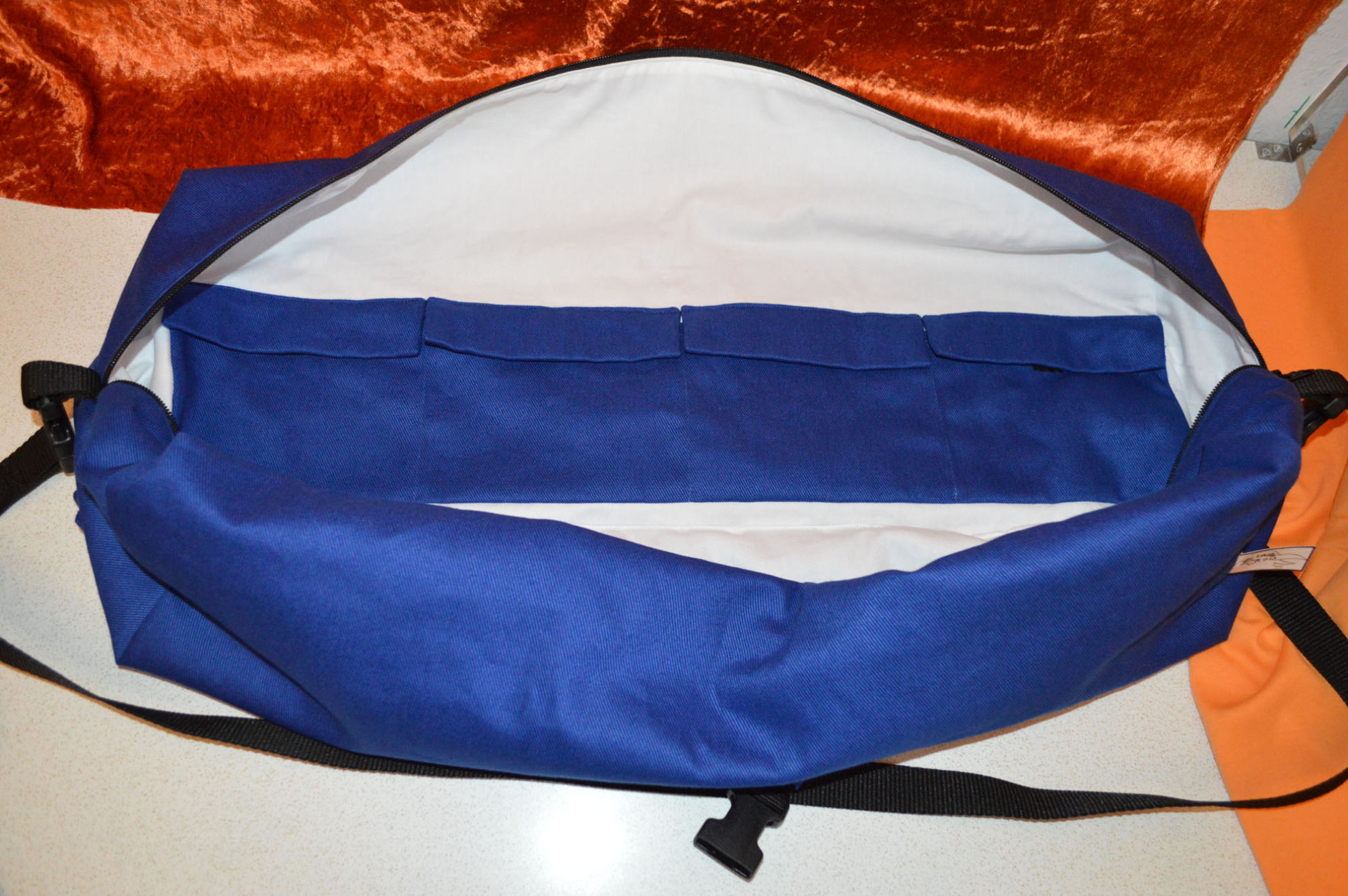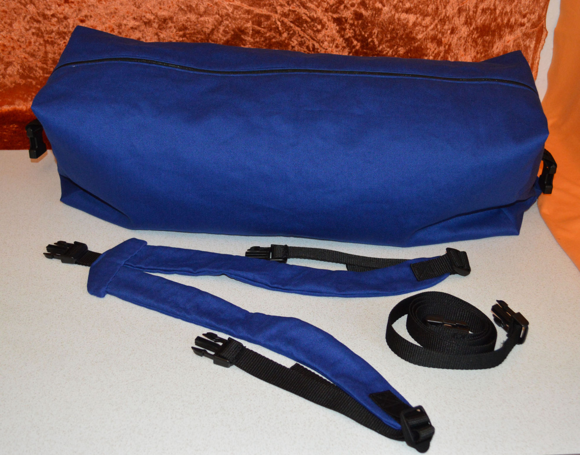 Material: Stoff Blau, Weiss, Reissverschluss, Gurt,                                              Steckschnallen, Schiebeschnallen,