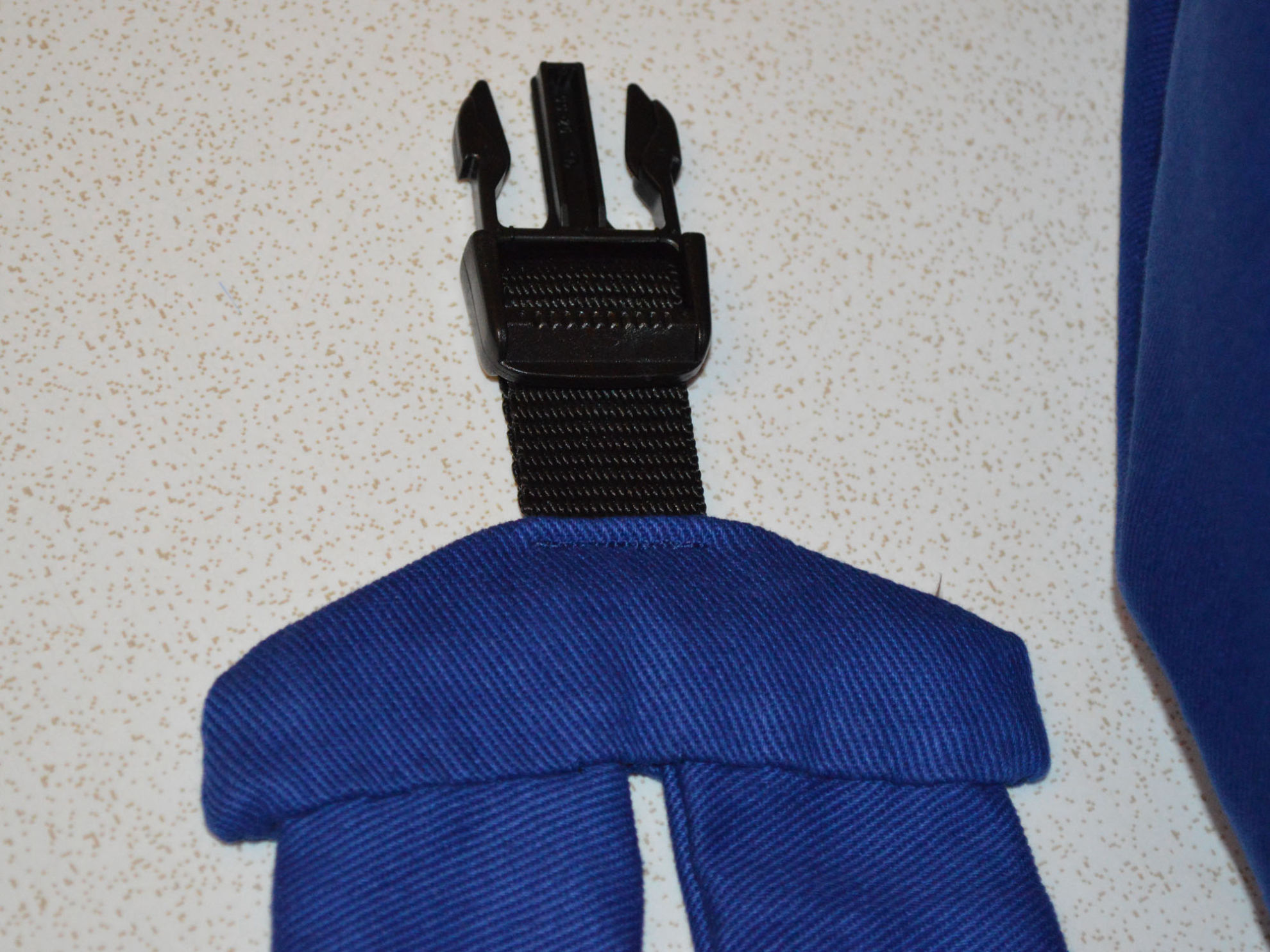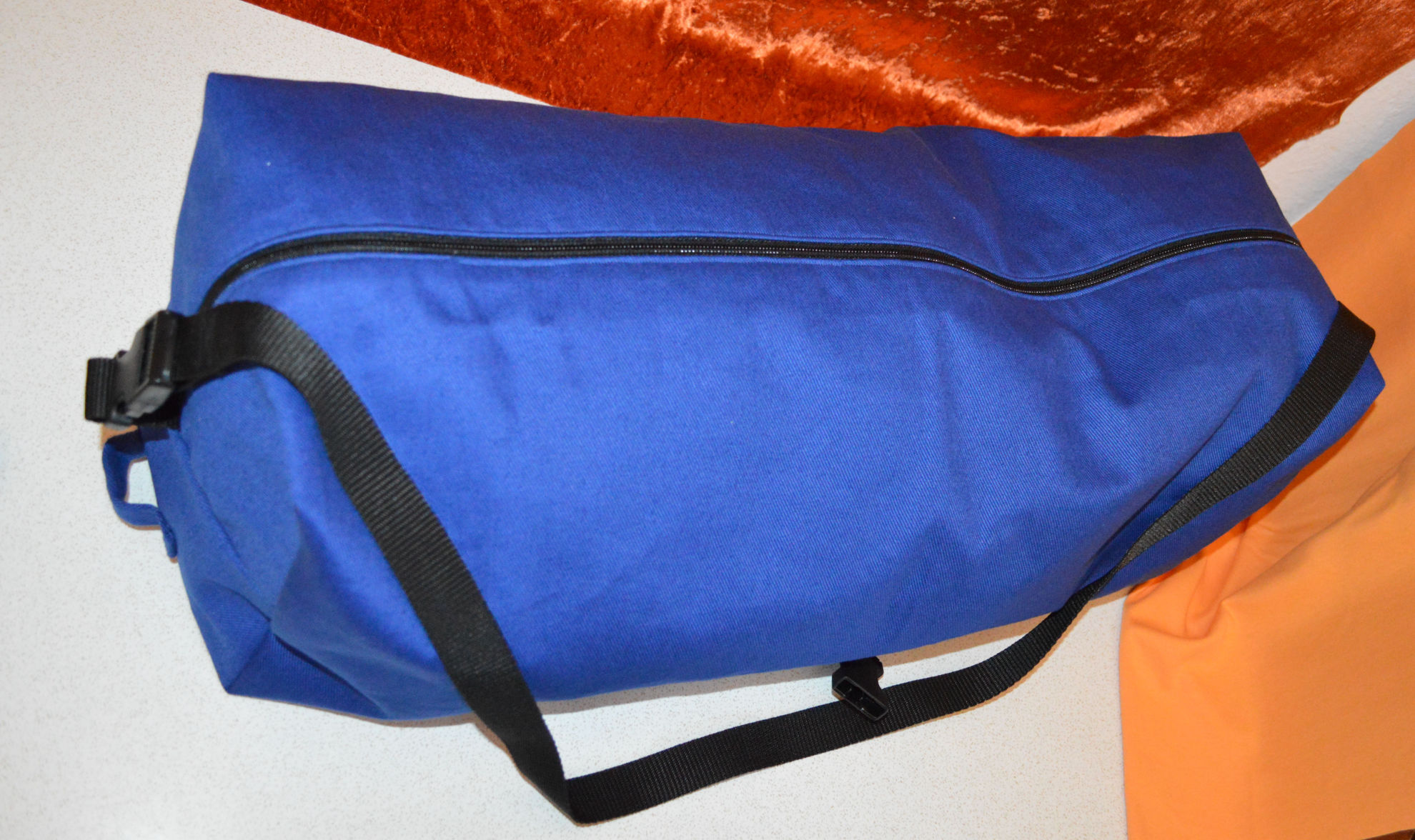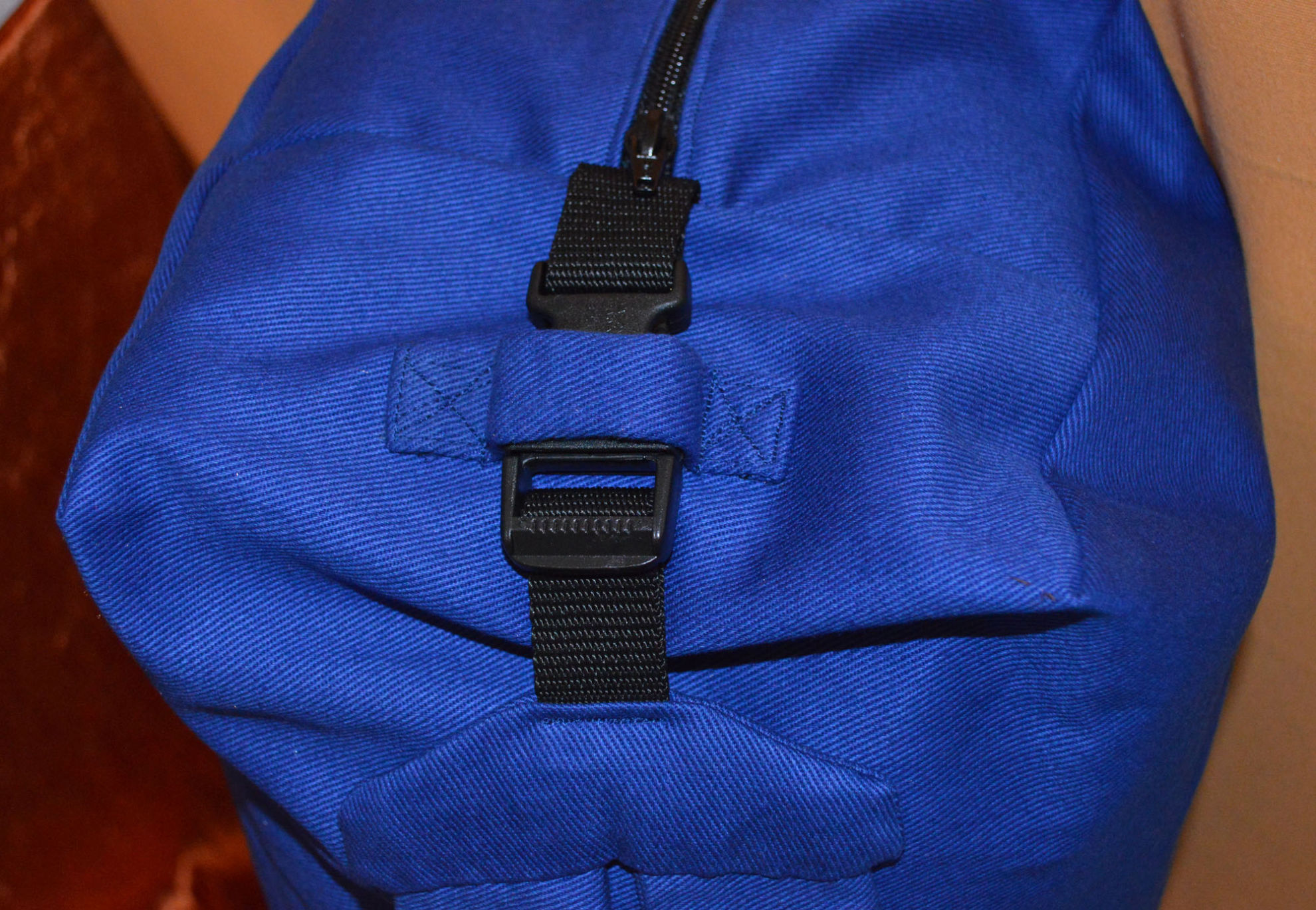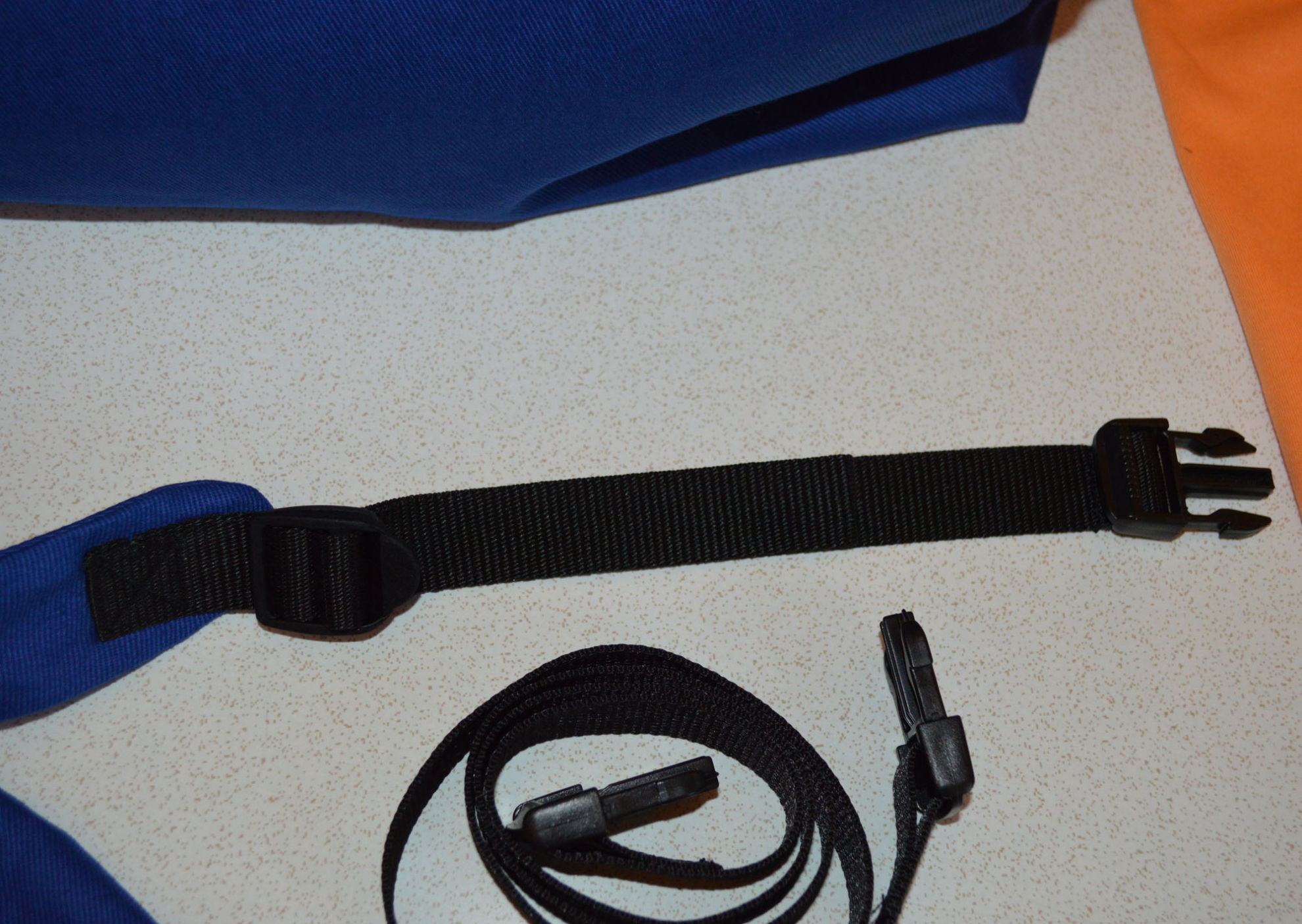 Material: Stoff Blau, Weiss, Reissverschluss, Gurt,                                              Steckschnallen, Schiebeschnallen,