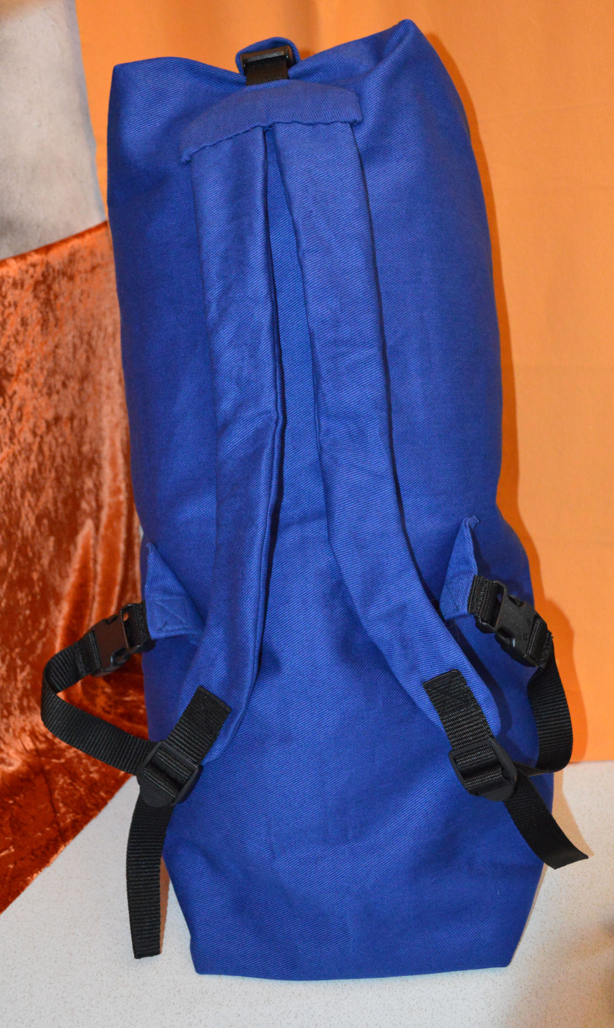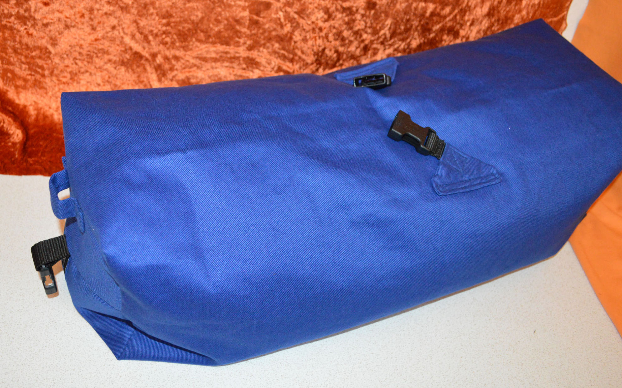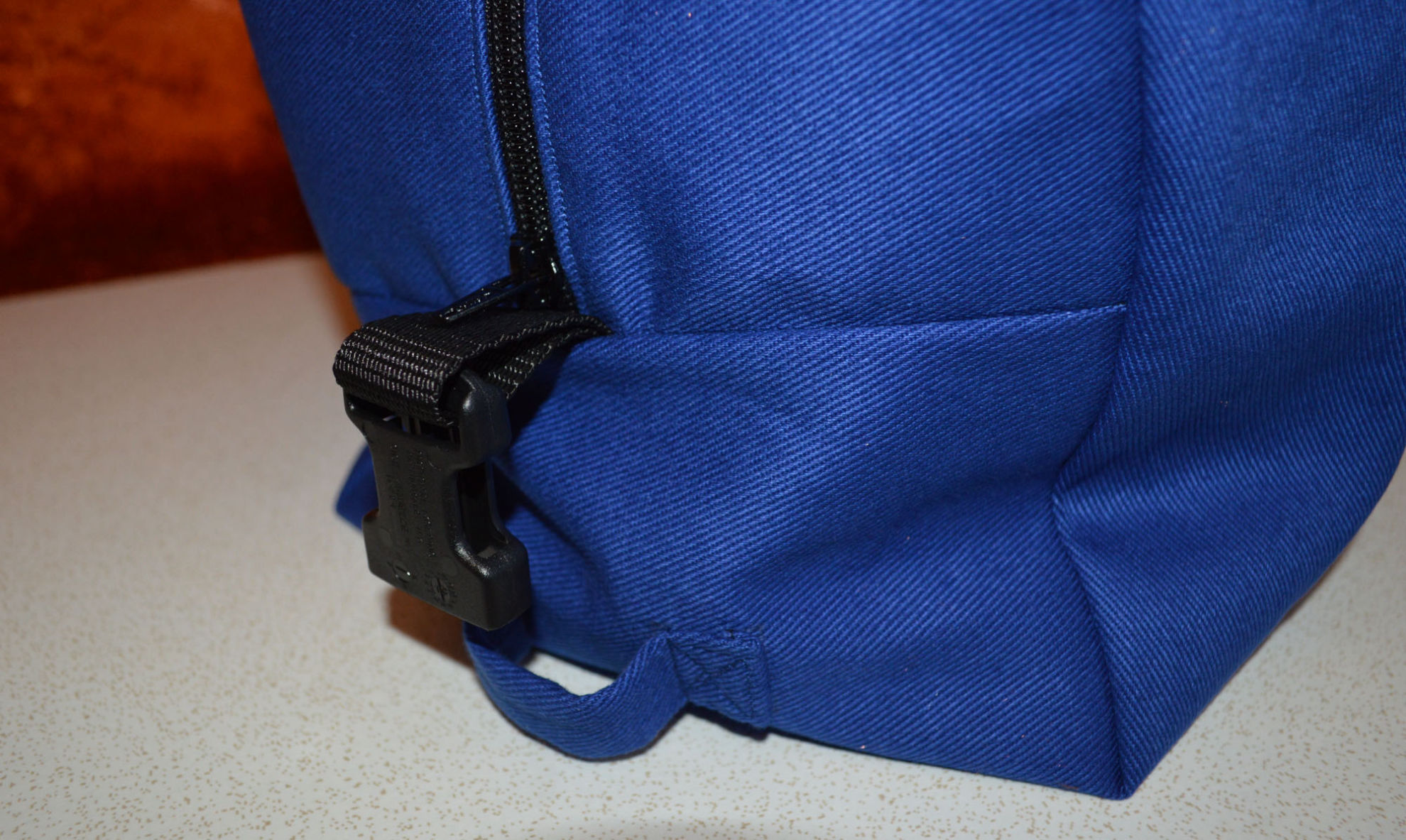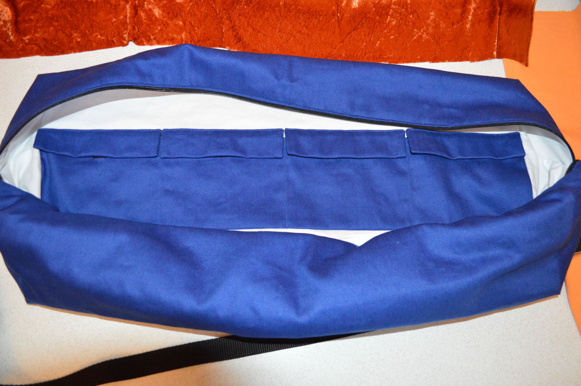 Material: Stoff Blau, Weiss, Reissverschluss, Gurt,                                              Steckschnallen, Schiebeschnallen,