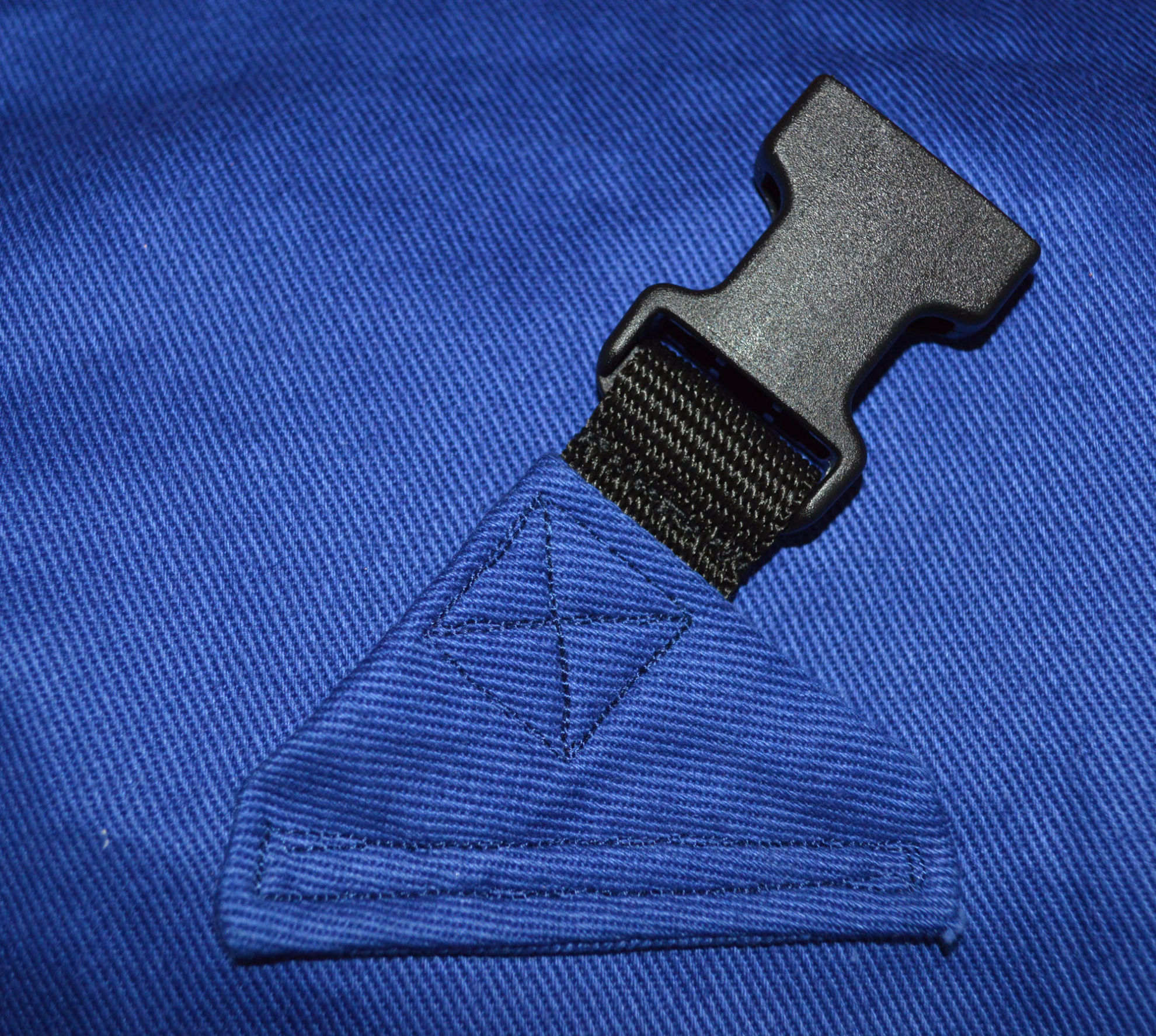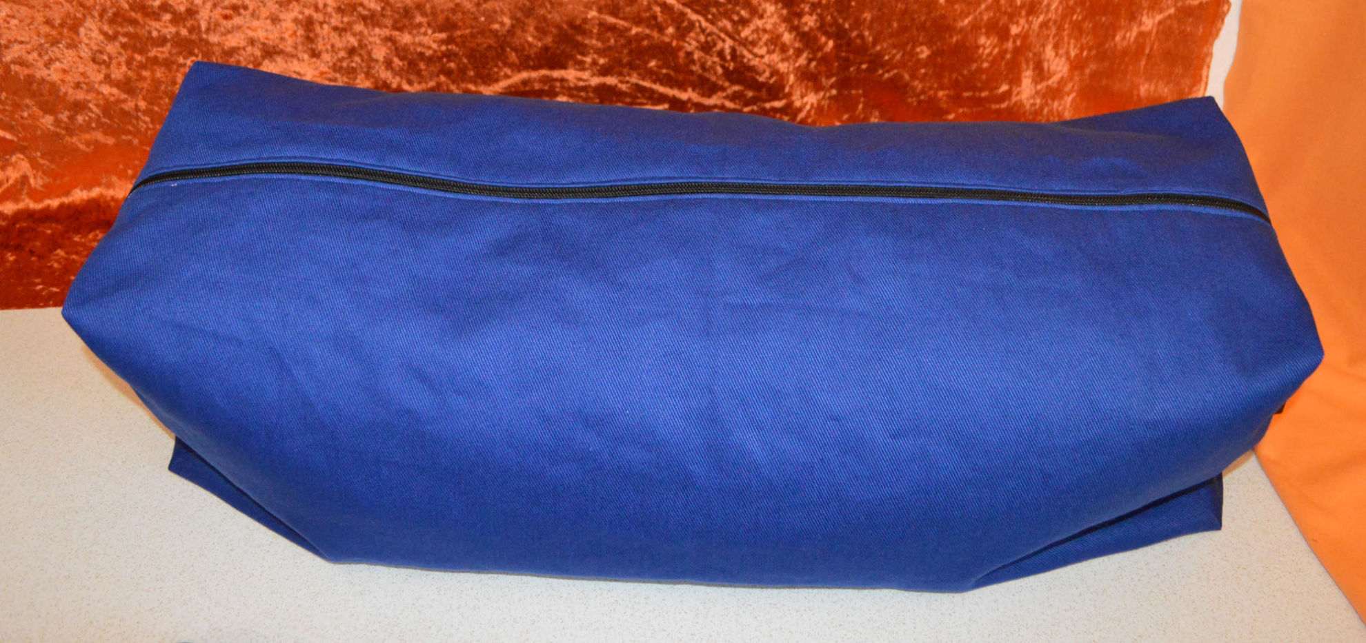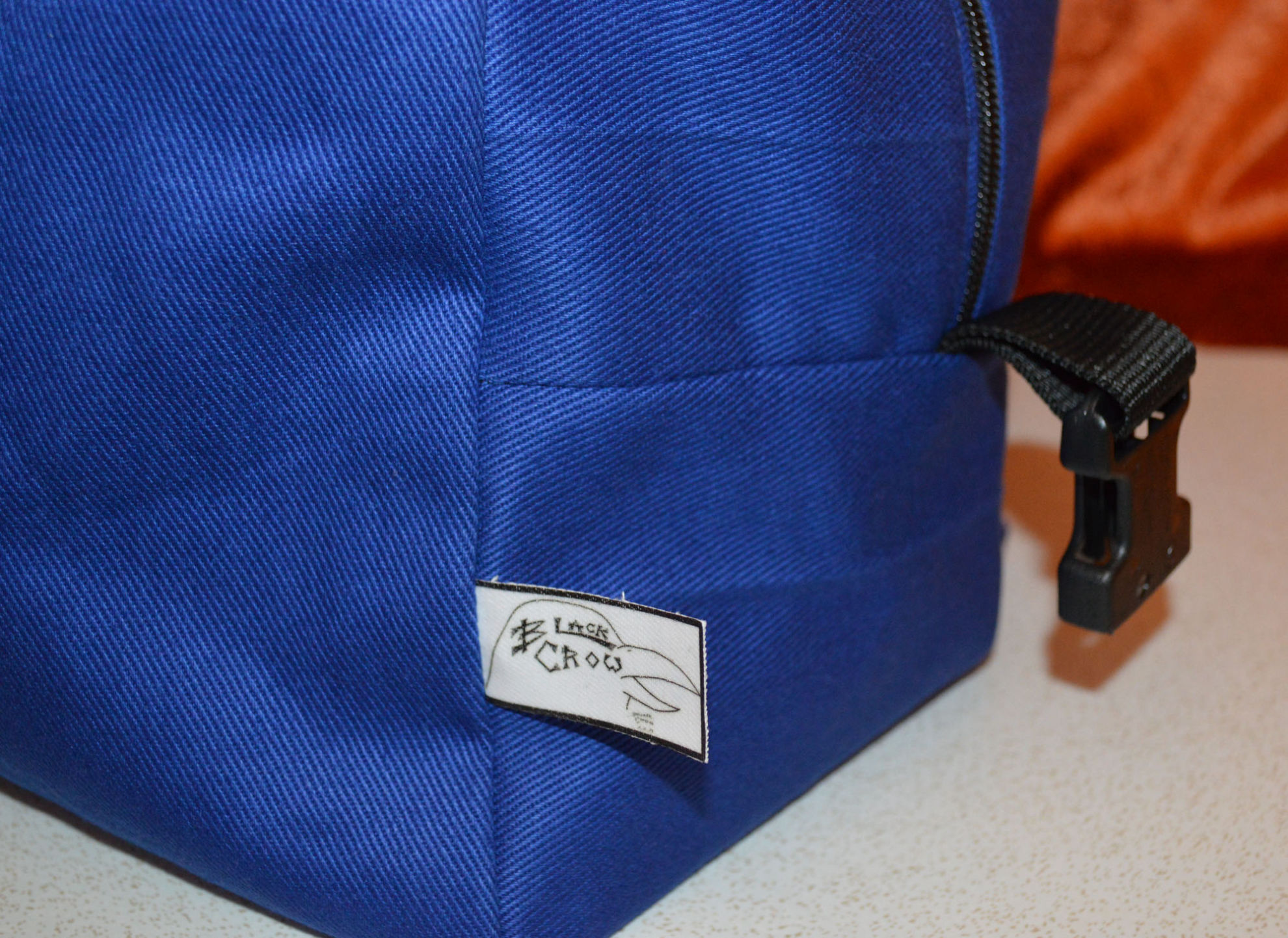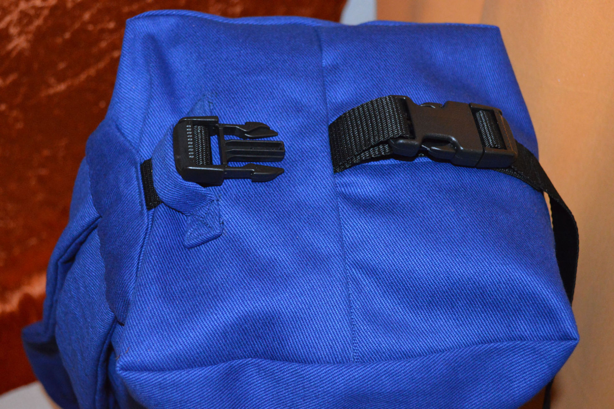Material: Stoff Blau, Weiss, Reissverschluss, Gurt,                                              Steckschnallen, Schiebeschnallen,